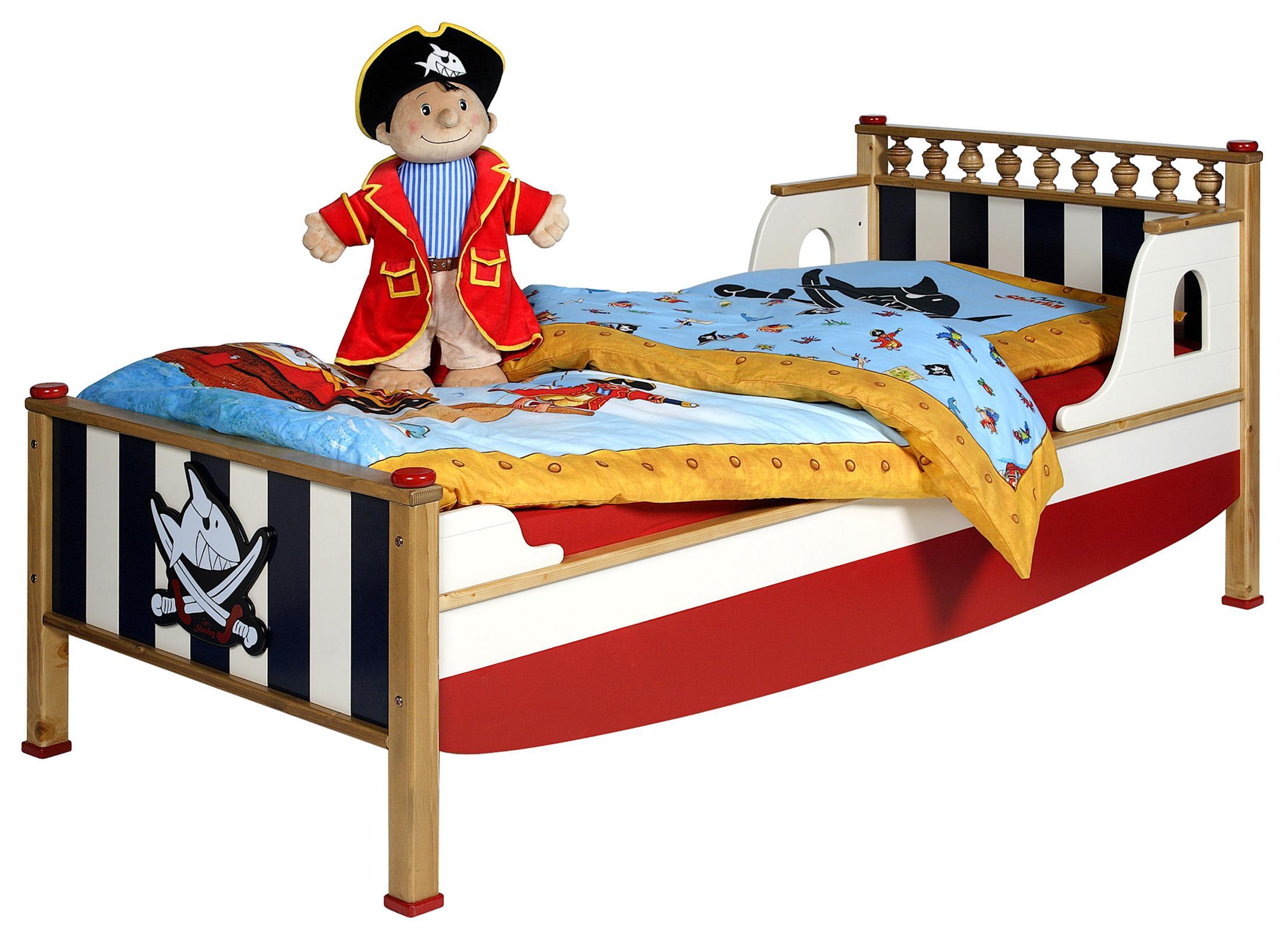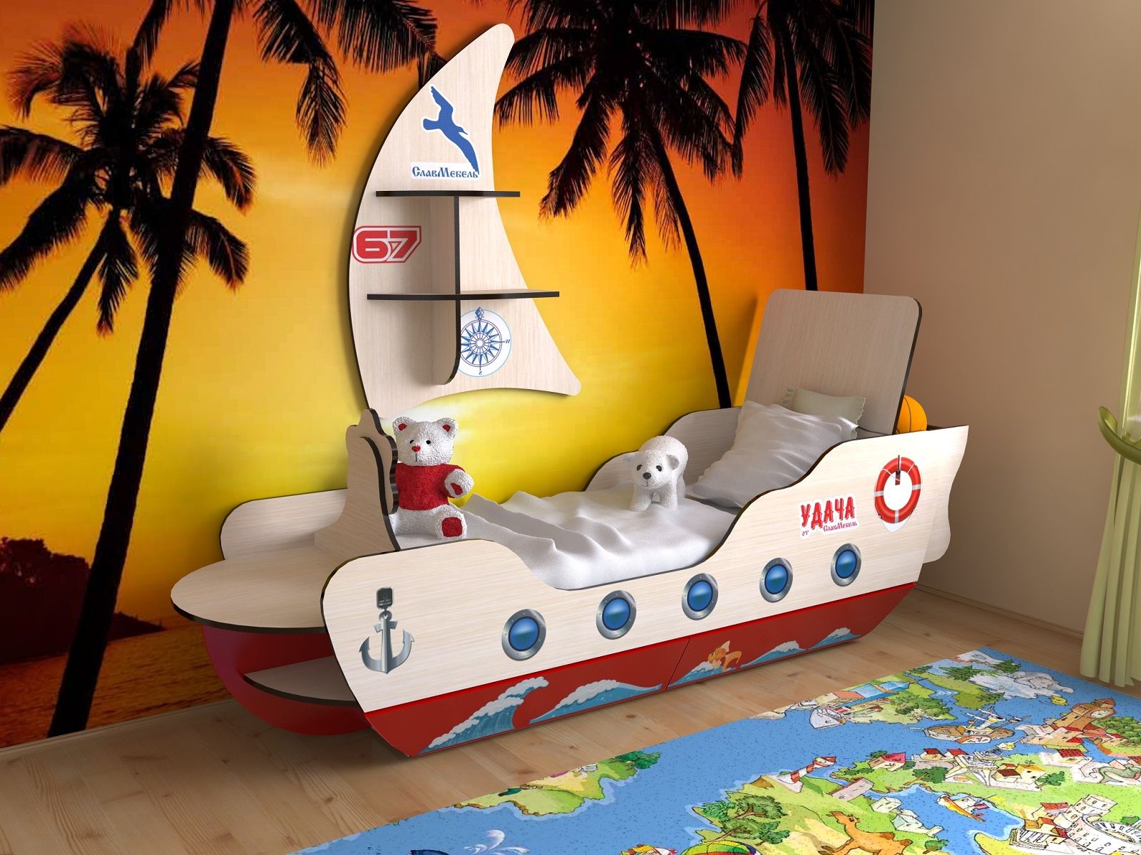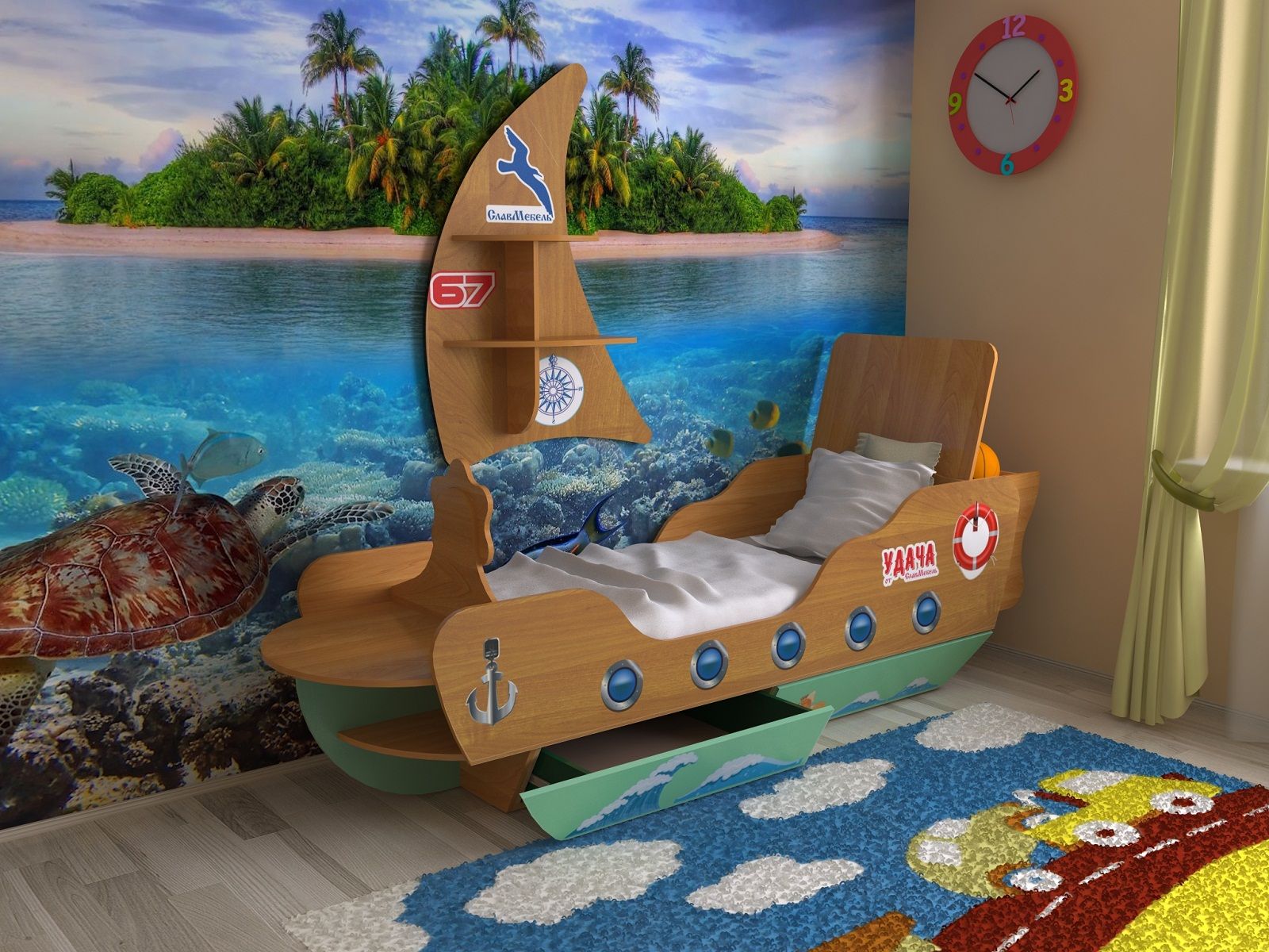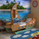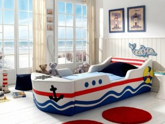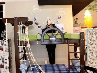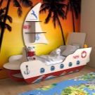 Ein Bett-Schiff ist nicht nur ein vollständiger Schlafplatz, sondern auch ein ganzes System für Spiele und Lagerung. Wenn Sie möchten, können Sie einfach ein Bett für einen Jungen in Form eines klassischen und eines Piratenschiffes mit Strickleitern, einem Mast und anderen maritimen Attributen bestellen.