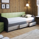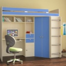 Betten für Jungen mit einem weichen Kopfteil sind sehr schön und komfortabel. Zusammen mit einem Bett können Sie ein zusätzliches Headset kaufen, das einen Arbeitsplatz und eine Wand zur Aufbewahrung wichtiger Kinderkleidung hat.