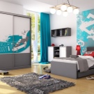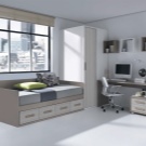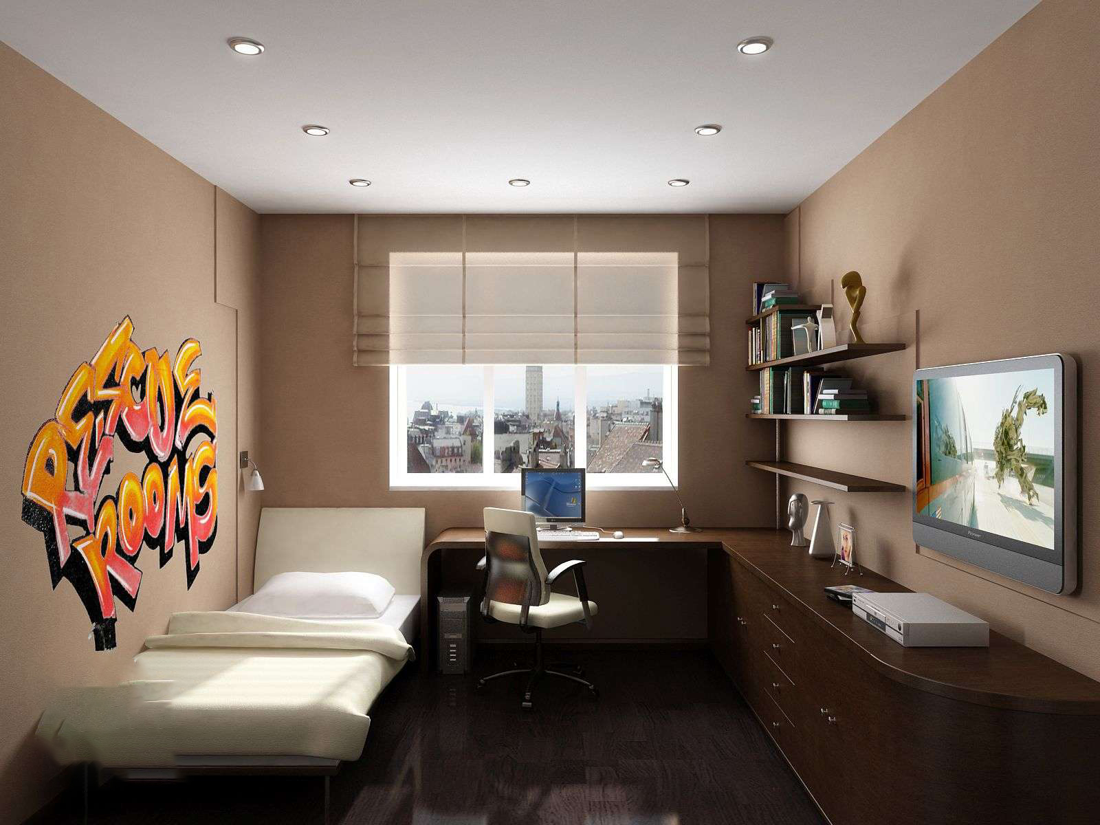 - Kleines, aber gemütliches Zimmer. Keine hellen Farben (außer einem hellen Akzent an der Wand in Form von Graffiti) und ergonomische Möbel, das sind die Hauptvorteile eines Zimmers für einen Teenager.