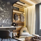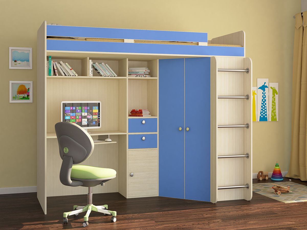 - Komfortables und multifunktionales Kinderzimmer, in dem sich mit Hilfe einer Holzkonstruktion deutlich Platz für Bewegung und Schlaf finden lässt. Der Liegeplatz ist auf der zweiten Ebene ausgestattet, und die Unterseite des Entwurfs ist von geräumigen Schränken besetzt. Auf der linken Seite sind Schubladen und Regale für Bücher, und es gibt auch einen separaten Tisch für Klassen. An einem solchen Ort wird das Kind ruhig und interessant sein.