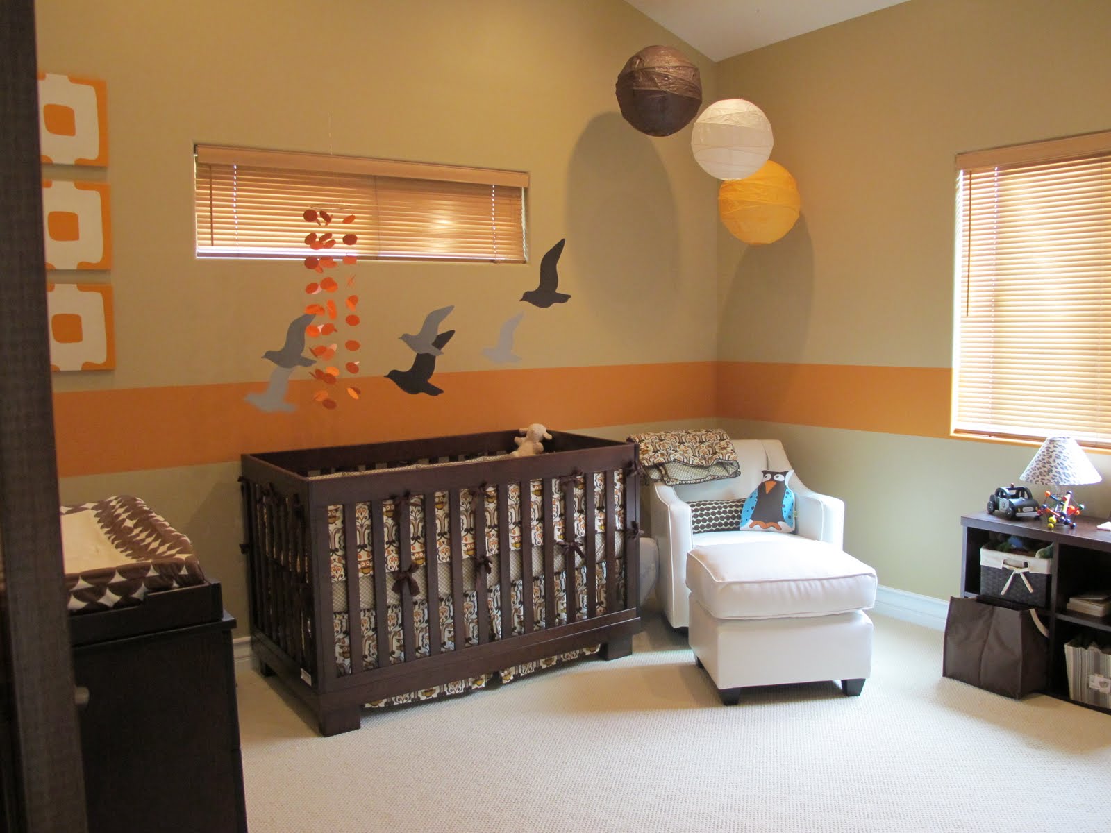 - Das Zimmer ist in braun-orange gehalten. Der helle Pfirsichfarbton passt gut zu einem dunkleren Schokoladenfarbton. Ein Minimum an Dekor in Form von Papierkugeln und Vögeln, sichere Möbel von kleiner Größe, ein Sessel für Mutter und Ottomane - alles war sehr gut gewählt.