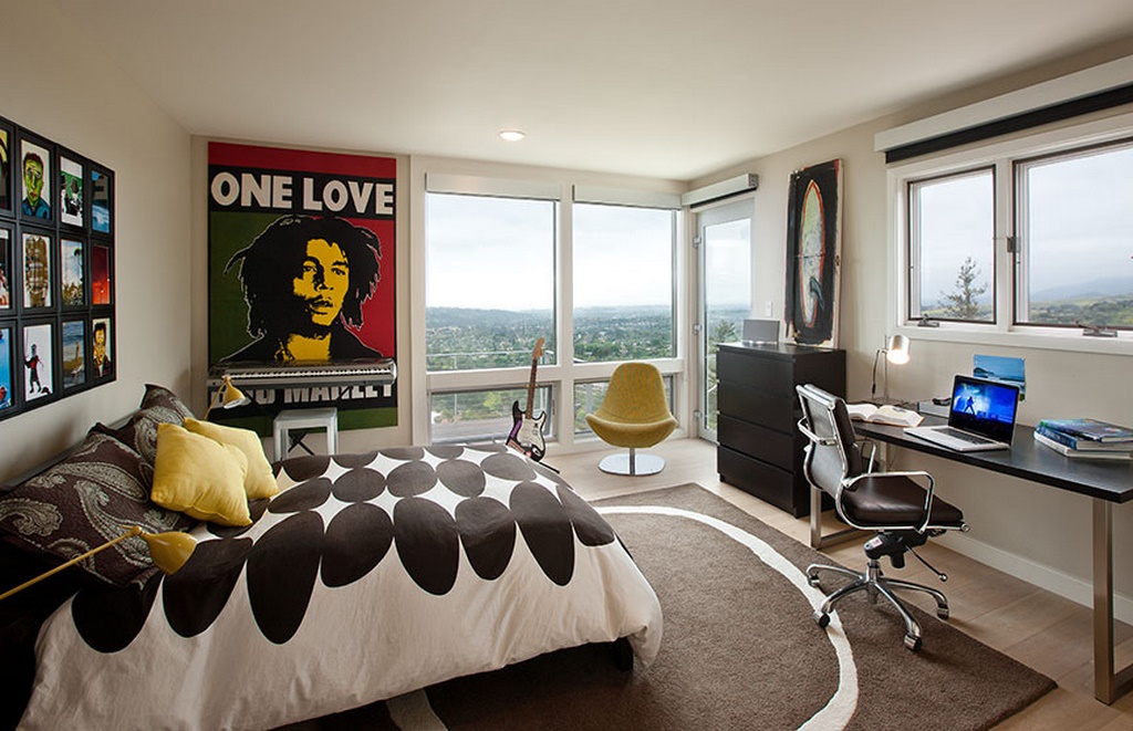 - Raum für einen Teenager - ein Musiker in ziemlich dunklen Farben mit hellen Akzenten in Form von Plakaten und Bildern. Bequemer Schlaf- und ergonomischer Arbeitsplatz, ein Minimum an Möbeln - das ist das Geheimnis erfolgreicher Gestaltung des Jugendzimmers.