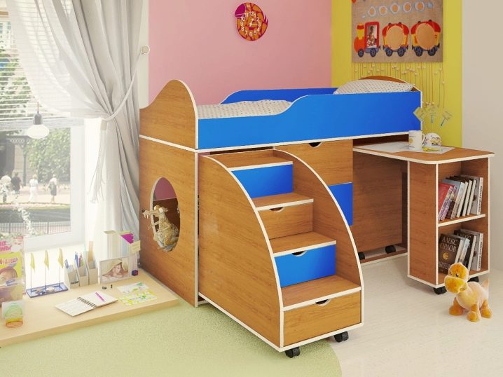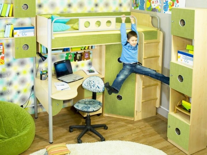 Nicht weniger interessant sind die Ecken mit einem Bett und einem Tisch, die alle Funktionen eines Kinderschlafzimmers vereinen.