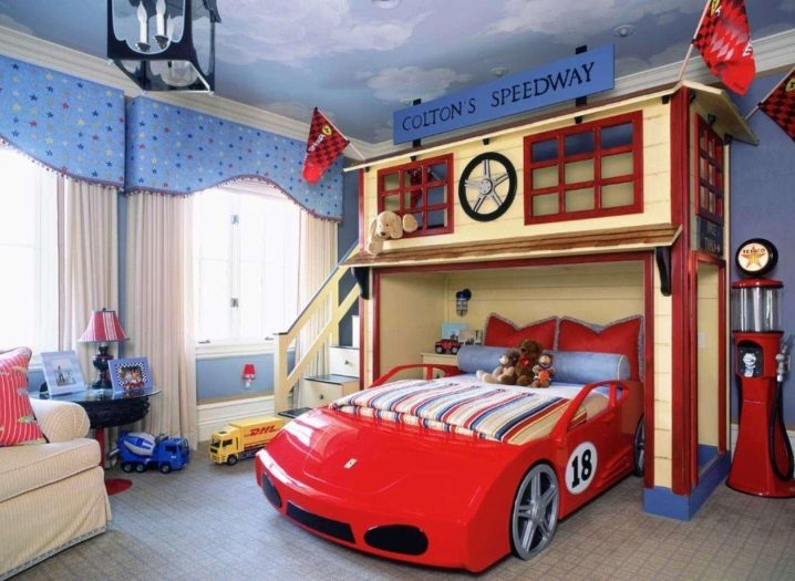 - Das originelle Kinderzimmer für den erwachsenen Jungen in blauen und roten Farben. Fast alle Attribute werden unter Berücksichtigung der Lieblingsthemen des Kindes gemacht: eine Bettmaschine, installiert in einer improvisierten Garage mit einem Haus im zweiten Stock, eine dekorative Tankstelle, helle Fahnen. An einem solchen Ort wird sich das Kind nie unwohl fühlen.