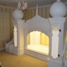 Romantiker werden ein Kinderbettchen schätzen, ähnlich dem Palast einer Prinzessin oder einer Ritterburg. Von Miniaturtürmchen mit Türmen und Fahnen deiner Lieblingsfarbe kannst du deine Spielzeugsachen sehen und ein "Prinzen" Taschentuch winken. Oder, zusammen mit Freunden, ist es laut, lustig und sicher, die Angriffe von "überlegenen feindlichen Kräften" erfolgreich abzuwehren. Oder, nachdem Sie sich hinter den festgezogenen Vorhängen zurückgezogen haben, schalten Sie die kleine Glühbirne in Ihrem Spielzimmer ein und lesen Sie Ihr Lieblingsbuch.