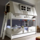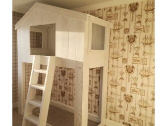 Unruhige Liebhaber der Größe und Anhänger des Sport-Lebensstils werden sicherlich ein Bett mit einem kleinen Haus im Obergeschoss bevorzugen - in Form eines Dachbodens. Typischerweise ahmen Designer eine Aussichtsplattform, ein Schiffshaus oder ein Baumhaus nach. Oft ist ein ähnliches Loft-Haus nicht nur mit dem Bett, sondern auch mit einer Spielecke und mit verschiedenen Sportgeräten, für Jugendliche und Kinder ab 3 Jahren (abhängig von der gewählten Konfiguration) kombiniert. Dort kann man mit Handläufen, einem starken Seil oder einem zuverlässigen "Fischernetz" die Treppe hinaufsteigen, und man kann den "Feuer" -Pol, die Strickleiter oder die von allen Kindern bewunderte Rutsche hinuntergehen.