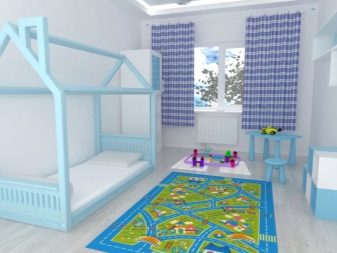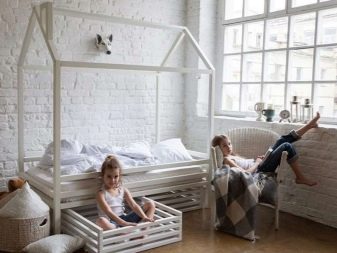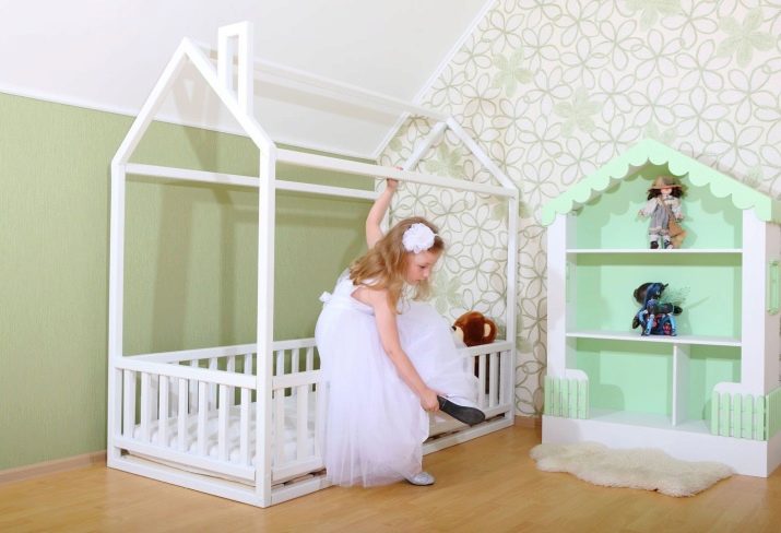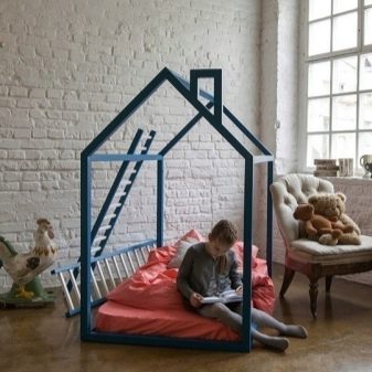 Standard-Designs von Kinderbetten in Form von Häusern können geschlossen oder offen sein. Die funktionellste ist die geschlossene Version, die auf das Vorhandensein eines Daches über dem Kopfteil eines Liegeplatzes, dichter Wände und Zäune hindeutet. Es ist sogar möglich, Beleuchtung für sie durchzuführen.Die offene Konstruktion des Schlafhauses simuliert nur die Wände und das Dach, aber es sieht heller aus und verstopft nicht den Raum des Kinderzimmers.