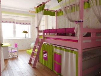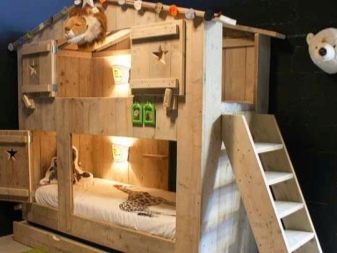 Zwei, drei, vier oder noch mehr Betten, die in verschiedenen Höhen und Winkeln befestigt sind, können selbst zu interessanten und funktionellen Teilen eines mehrstöckigen Gebäudes für junge Familienmitglieder werden. Und um alle auf einmal zufrieden zu stellen, können Sie sich für ein Bett im minimalistischen Stil, aber mit hellen Details entscheiden.