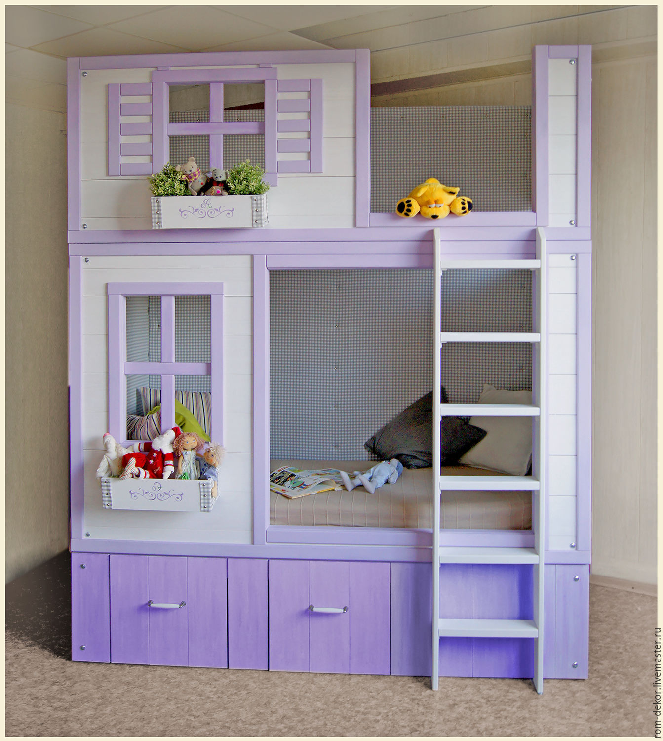 Übrigens ist es am einfachsten, ein solches Bett mit Ihren Kindern zu machen - Hauptsache, alles richtig zu kalkulieren, hochwertige und sichere Materialien und Farben zu wählen, Werkzeuge, Kinder und kleine Objekte voneinander zu lösen und schließlich das zusammen zu montieren wird nachdenken.