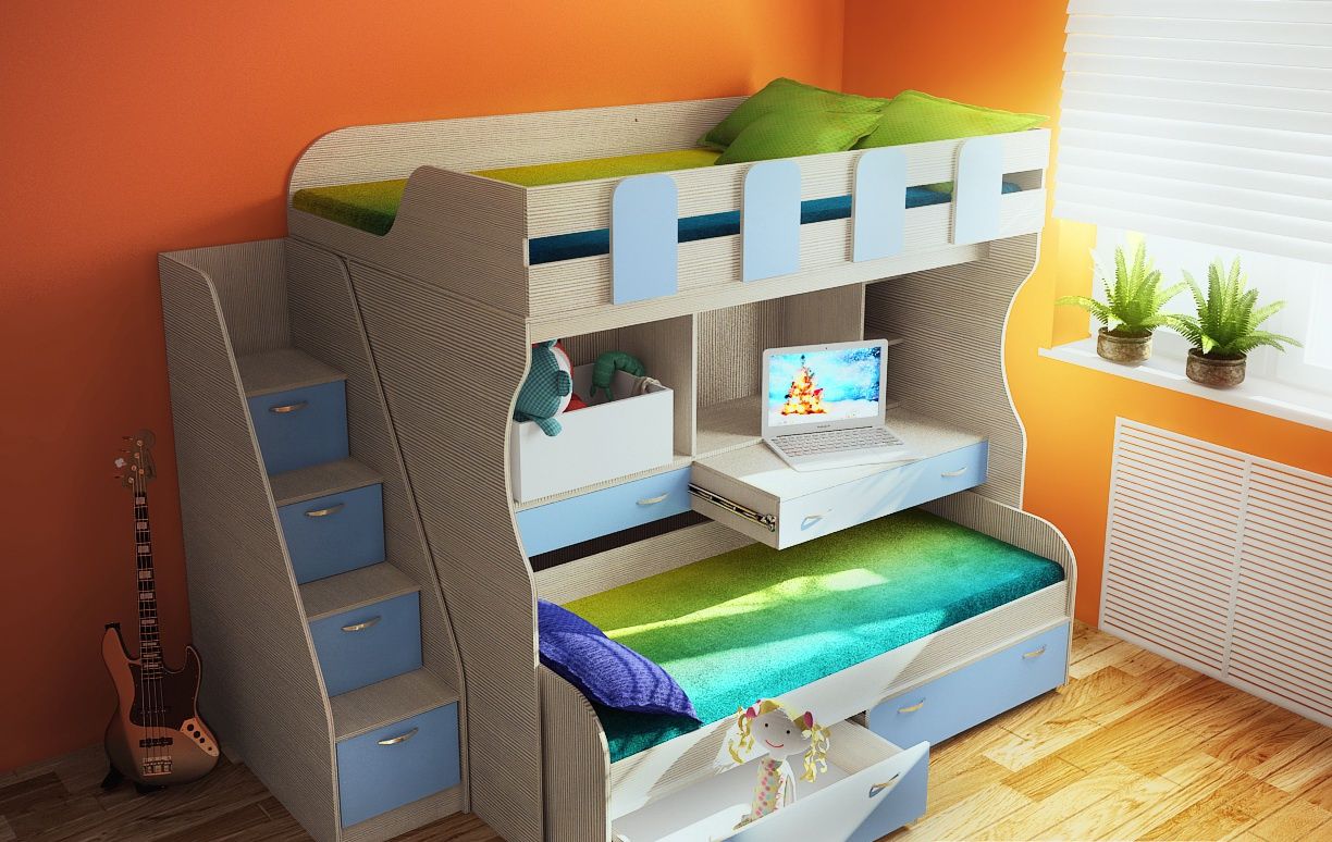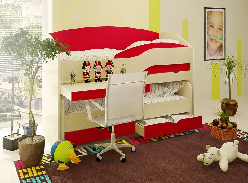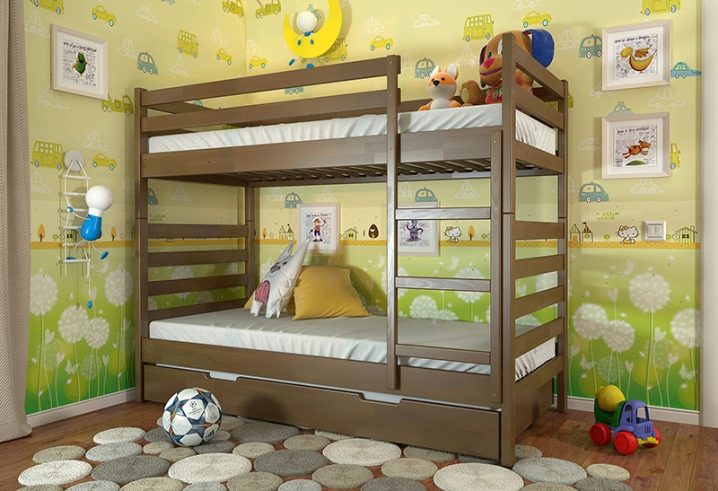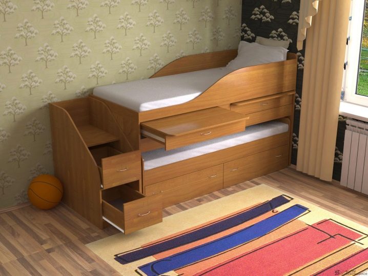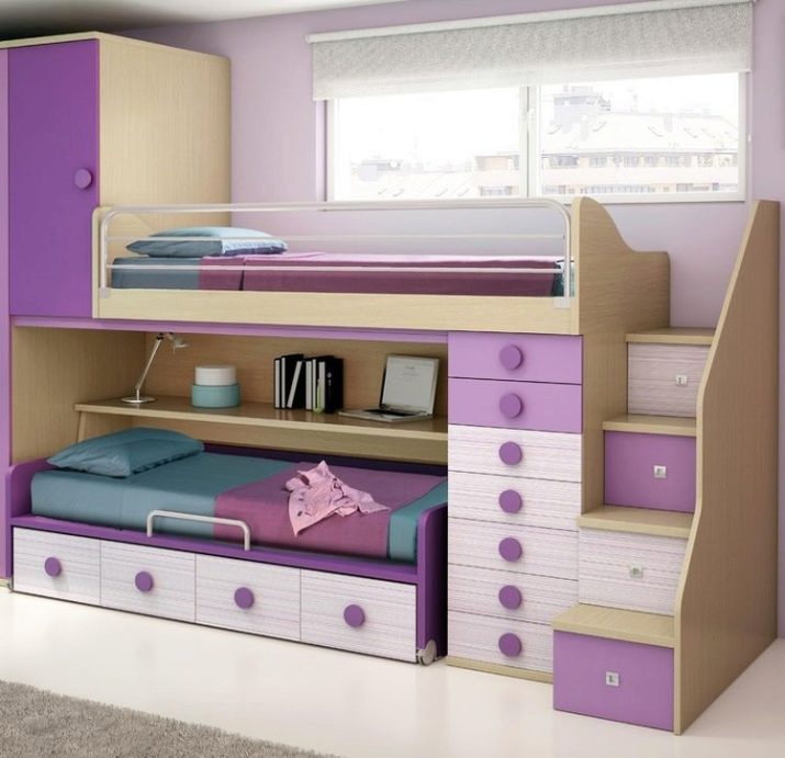 Etagenmöbel unterscheiden sich in Aussehen und Funktionalität. Sie sollten in Abhängigkeit von der Fläche der Baumschule und der Verfügbarkeit anderer Möbel ausgewählt werden.