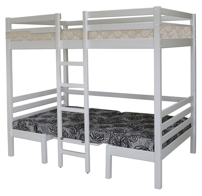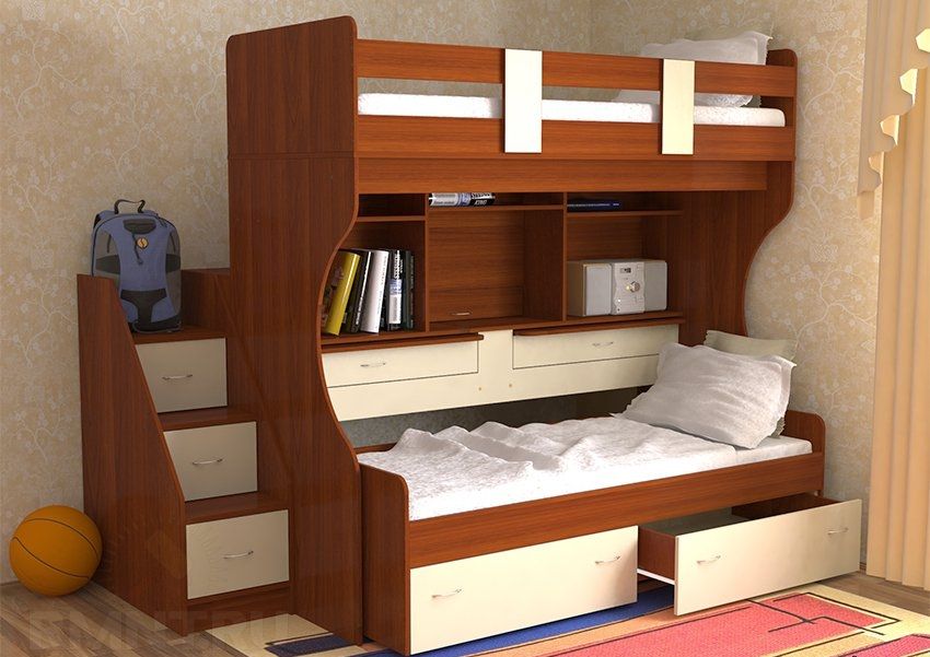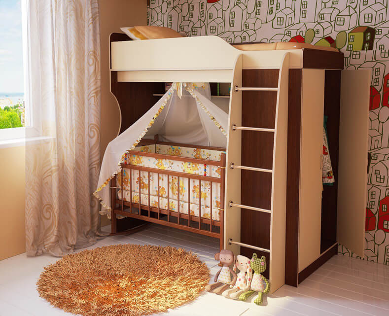 Es gibt andere Modelle speziell für die Eltern von zwei Kindern mit einem kleinen Altersunterschied. Die obere Etage ist für ein älteres Kind konzipiert und präsentiert sich im klassischen Look eines Etagenbettes.Der untere Teil ist eine Krippe, die für eine Babygeburt geeignet ist. Zusätzlich ist am Boden eine Kommode angebracht, die beim Wachstum des Neugeborenen entfernt und das Bett länger wird. Wie Psychologen sagen, ermöglicht diese Option, das ältere Kind nicht von der Mutter zu trennen und den Stress durch das Auftreten des zweiten Babys in der Familie auszugleichen.