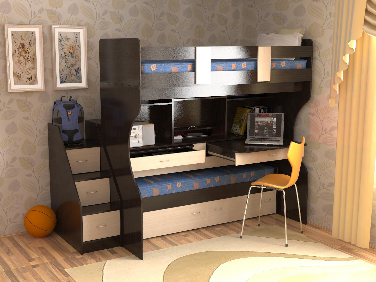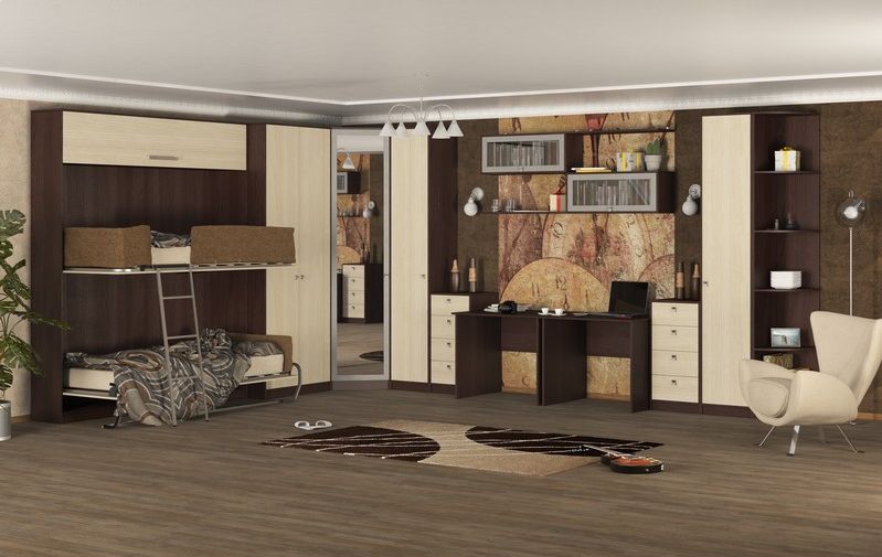 Heute haben Designer das Design der "Garderobe + Bett + Tisch" für ein Kind in einem Modell für zwei Kinder verbessert. Das zweite Bett befindet sich hier bequem auf dem Kabinendach. Dies ist eine erstaunliche Möglichkeit, Platz zu sparen, jedoch ist das Kind an der Spitze nicht in einer sehr vorteilhaften Position. Zum Beispiel, wenn die Höhe des Schrankes ausreichend ist, kann sich das Kind auf der oberen Etage nur wohl fühlen. Bei der Wahl dieser Option ist es wichtig, die Größe des Bettes mit der Höhe der Decke zu korrelieren.