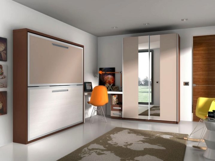 Mit Hilfe eines Klappmechanismus steigt das Bett tagsüber an die Wand und nimmt eine vertikale Position ein und stellt eine Reihe von Schubladen oder Spiegeln dar. In der Regel ist das Bett an den Seiten der Betten mit geräumigen Kleiderschränken und Regalen für die bequeme Platzierung von Dingen für Babys ausgestattet.