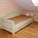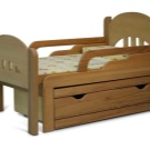 Viele können sich keine teure Eiche oder Mahagoni leisten, also wählen sie dieses Material. Es ist jedoch anzumerken, dass die Kiefer ihre eigenen schwerwiegenden Nachteile hat: Betten aus Nadelrassen sind zerbrechlicher als Hartholz, daher passen sie nicht zu einem sehr aktiven Kind, Kiefer ist weich genug und mit der Zeit lockern sich die Schrauben und Nägel.