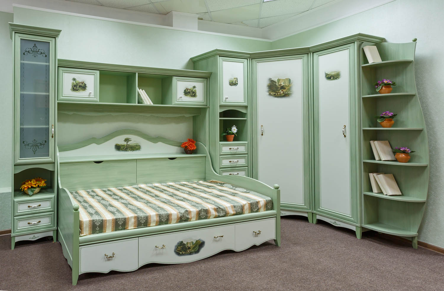 - Grün Das Bett dieser Farbe passt perfekt in den Raum im Öko-Stil, wird ihm Frische verleihen. Textil mit einem Blumendruck wird hier angebracht sein.