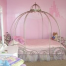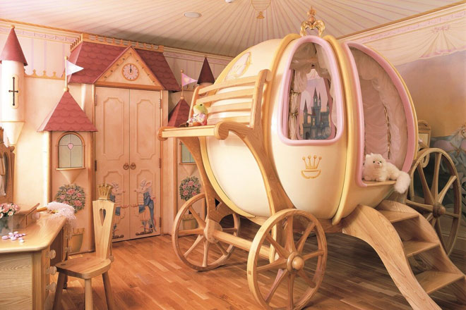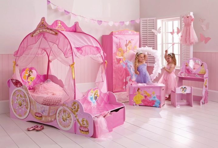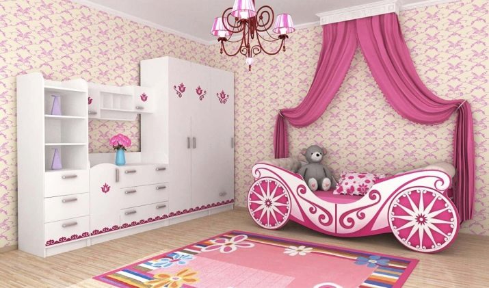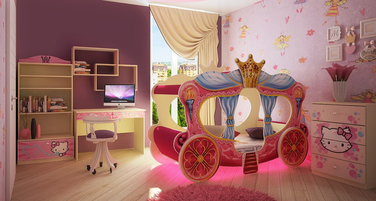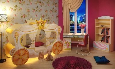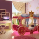 Das Bett selbst muss auch die Wünsche Ihres Kindes erfüllen. Natürlich ist der gotische Stil des Mittelalters für die Gestaltung des Raumes nicht ganz geeignet. Schließlich zieht das Kind im Grunde alles Wissen aus Büchern, Zeichentrickfilmen, in dem diese Epoche ganz anders dargestellt ist - da erscheint es nicht so düster und traurig.In den Büchern wird sie lustiger dargestellt - wunderschöne Königreiche mit Schlössern, Prinzen und Prinzessinnen in luxuriösen Kostümen, die in Kutschen zum Ball kommen, überall werden helle und schöne Farben verwendet - viele Rosatöne. Daher sollte die Gestaltung des Raumes in diesem Stil erfolgen, aber mit verschiedenen Ausnahmen - etwas muss hinzugefügt werden und etwas komplett ersetzt oder entfernt werden.