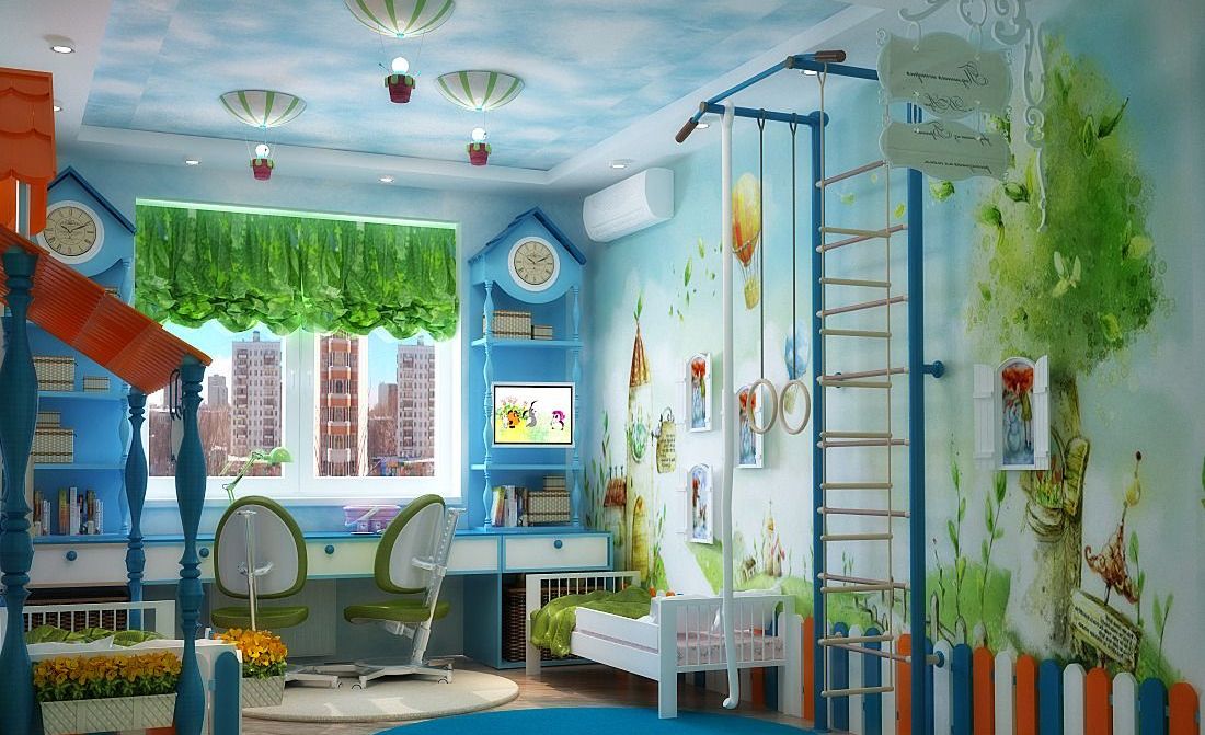Ein Bett mit einem Hebemechanismus ermöglicht es, Platz für Spiele und Aktivitäten für das Kind im Raum zu sparen: Dinge, Spielsachen und Textilien, die nicht jeden Tag benutzt werden, in den Keller zu legen.