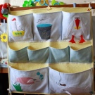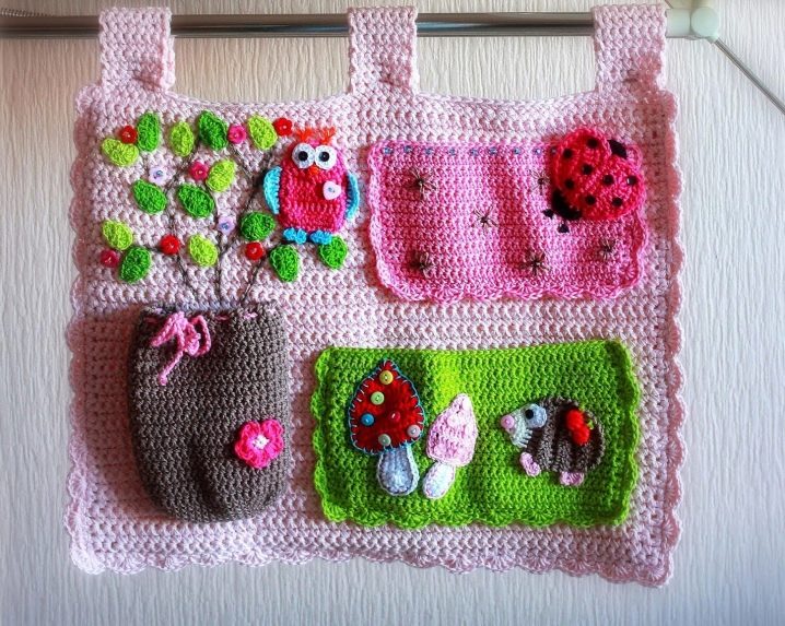 Organisatoren mit Taschen können sehr verschieden sein, sowohl in der Farbe als auch im Aussehen und der Anzahl der Taschen. Alles hängt von den Bedürfnissen der Mutter und ihrer Vorstellungskraft ab. Dies kann eine große Tasche, viele kleine oder Taschen unterschiedlicher Größe auf einer Leinwand sein.