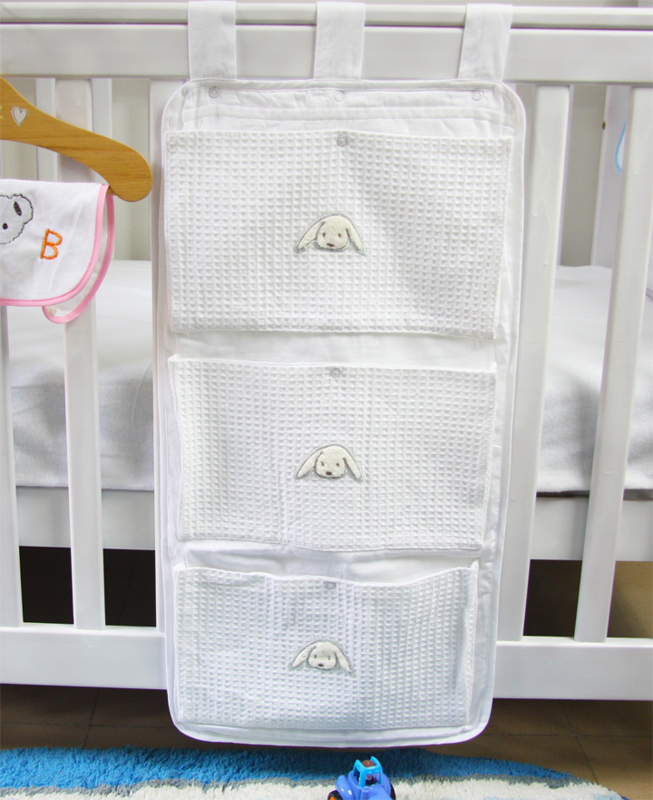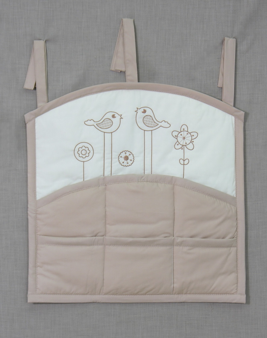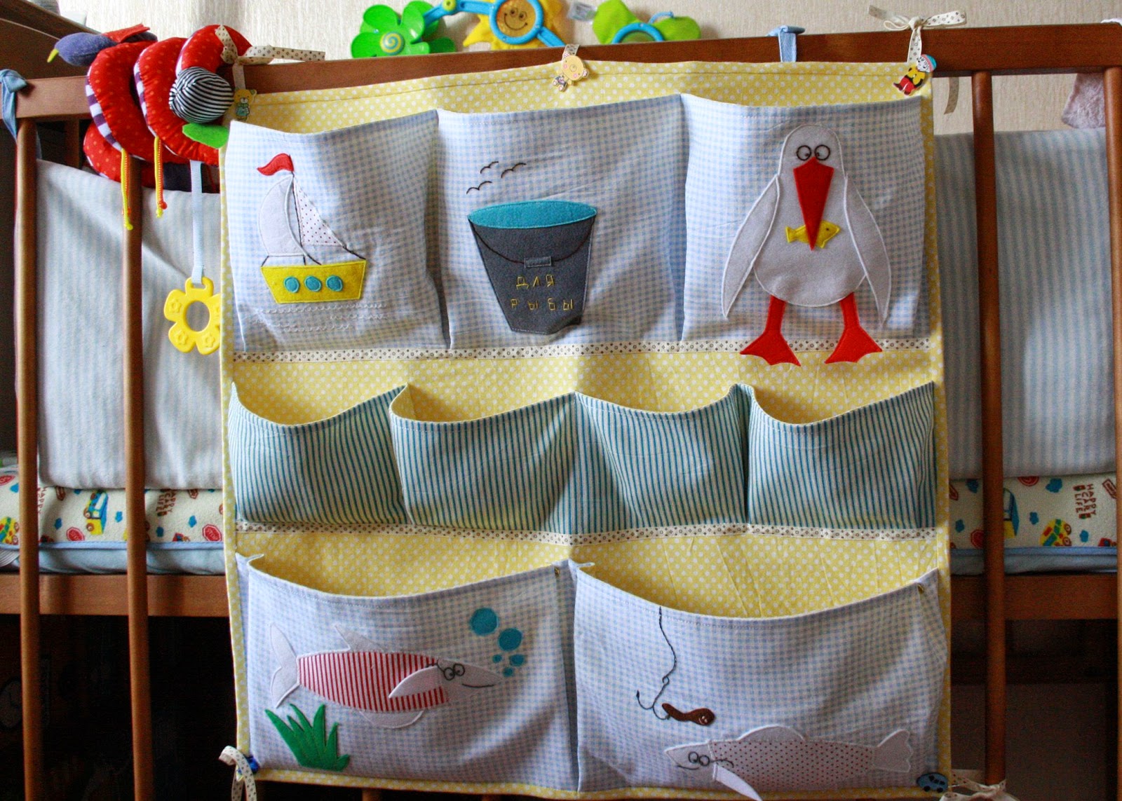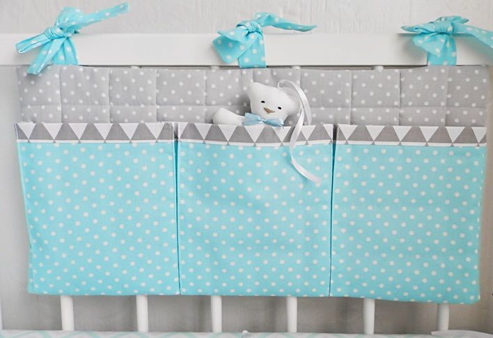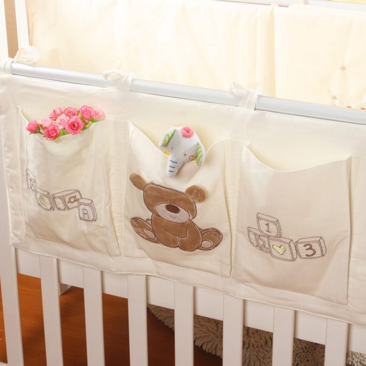 Taschen können flach oder dreidimensional sein, mit Bildern, Applikationen oder Stickereien.Sie können verschiedene Materialien verwenden, Stoff mit Bildern auswählen, mit Knöpfen, Bändern oder Spitze verzieren. Die Methoden zur Befestigung am Bett können ebenfalls variiert werden: Sie können Verschlüsse aus dem Hauptgewebe, aus Bändern oder anderen Materialien herstellen. Sie können die Tasche nur an der Oberseite befestigen, und Sie können in vier Ecken. Alles ist nur durch das Modell der Krippe und Ihrer Phantasie begrenzt.