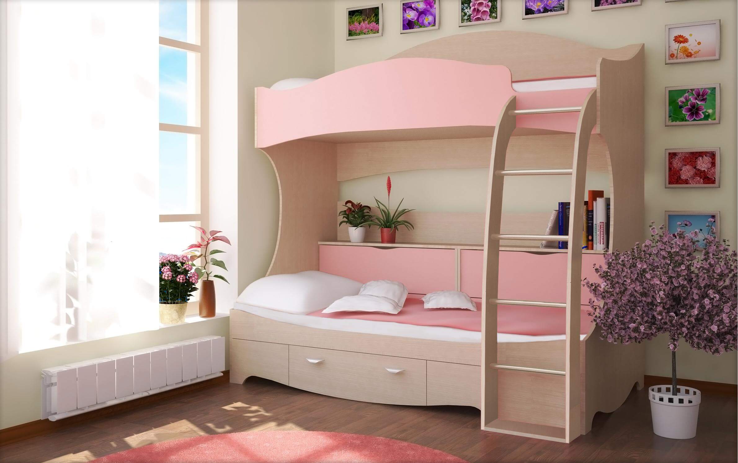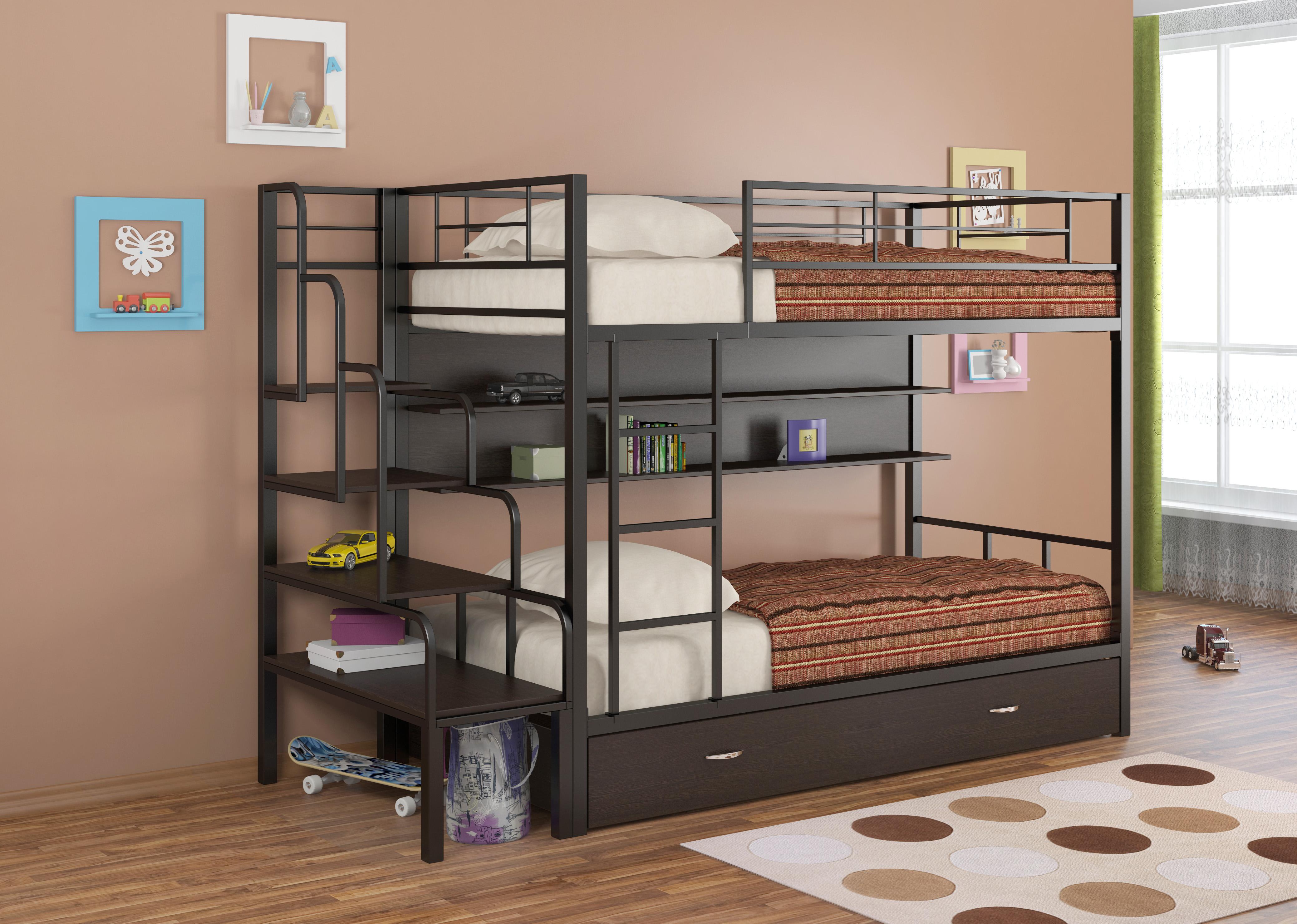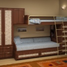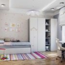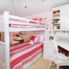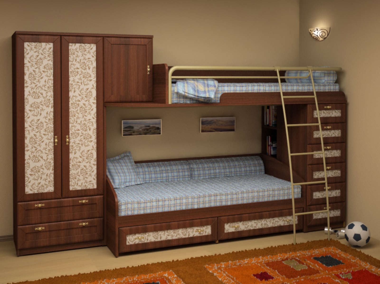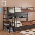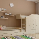 - Ein Etagenbett ist geeignet, wenn Sie zwei Kinder haben. Es wird ein interessantes Element des Interieurs sein. Oft verfügen solche Modelle über Schubladen, in denen Sie verschiedene Dinge verstauen können, sowie mit einem Spielkomplex ausgestattet sind.