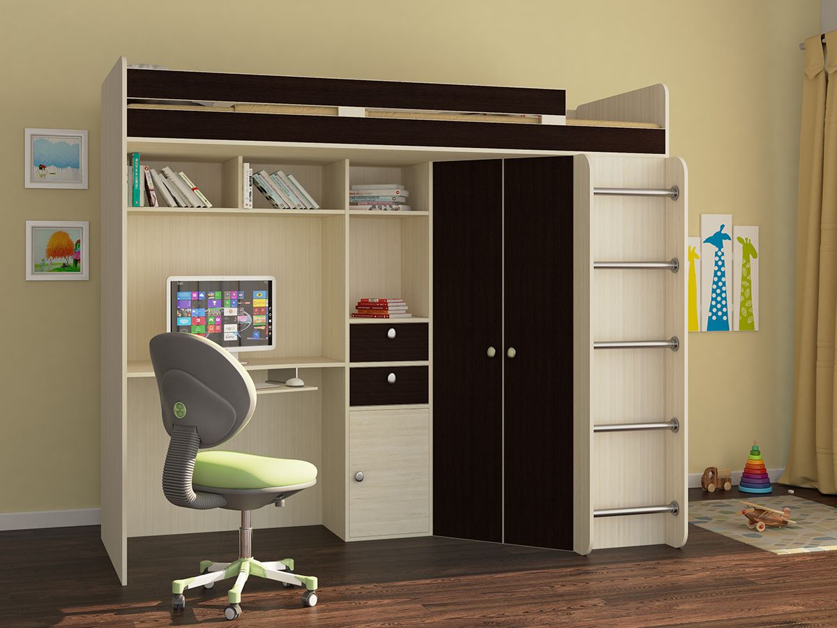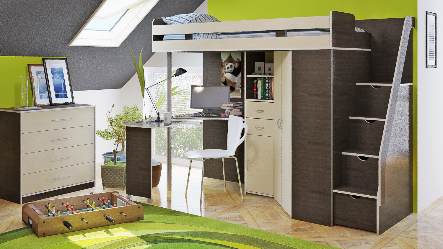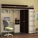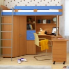 - Das Bettdachboden vom Massiv eines natürlichen Baums - wird die modische und funktionelle Entscheidung von Jugendmöbeln für einen Traum werden. Unter dem Bett sind Schließfächer, wo Sie Kleidung und andere wichtige Dinge speichern können, und ein Tisch für das Training, und auf der Seite sind die Komponenten von Sportgeräten, wie ein Seil, Reck, Strickleiter.