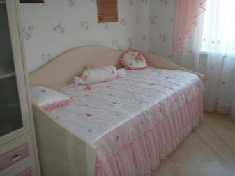 Wenn das Bett einen Rücken hat, dann lohnt es sich, einen Vorrat von nur 10 cm zu haben, damit Sie leicht füllen können. Für diese Option eine tolle Abdeckung mit einem elastischen Band. Diese Option ist nicht sehr beliebt, aber vergeblich. Solche Abdeckungen müssen nicht gebügelt werden, da sie eine konstante Spannung haben, sich nicht bewegen, wenn das Kind ständig auf ihnen steht, keine Falten haben und ordentlich aussehen. Es ist einfach und hochwertig, das Bett mit solch einem Schleier zu füllen, kann sogar ein kleines Kind.