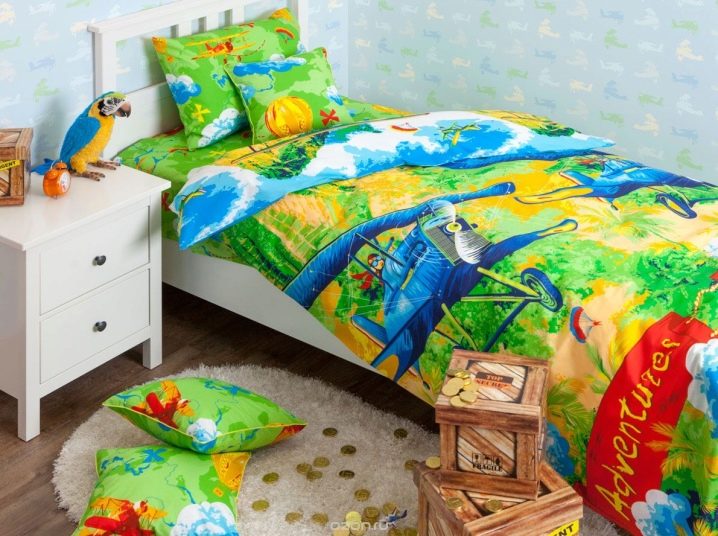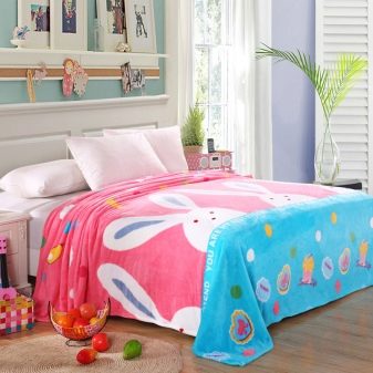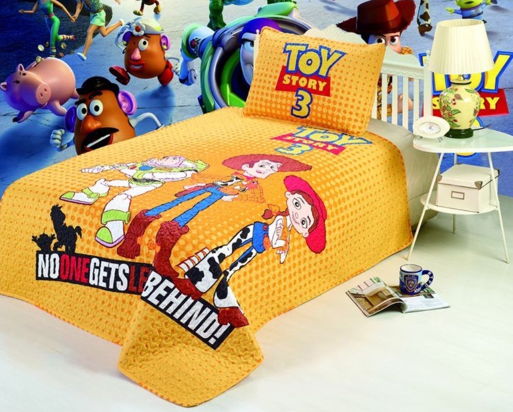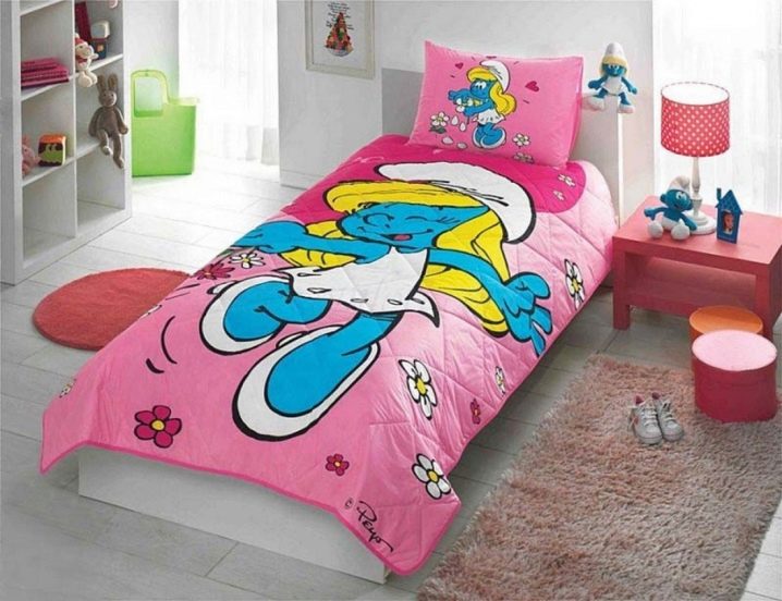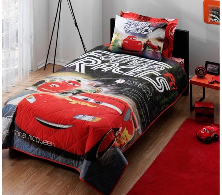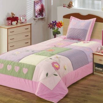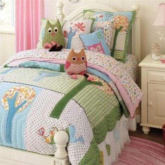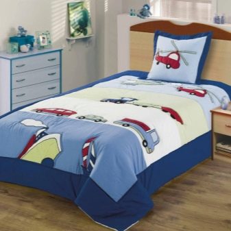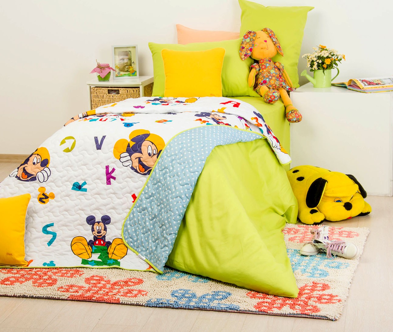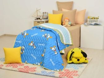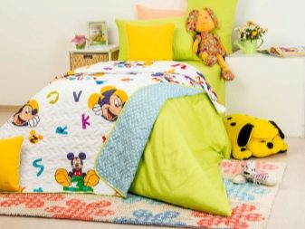 Für ältere Kinder können Sie mit Hilfe einer Tagesdecke einen hellen Akzent im Innenraum setzen. Helden von Lieblingsmärchen, Cartoons werden gut darauf aussehen und werden Ihr Baby nicht gleichgültig lassen. Aber solche Bettdecken können schnell nerven.Nach ein paar Monaten mag das Kind einen anderen Cartoon mögen und er wird eine neue Decke mit einem neuen Helden anfordern.