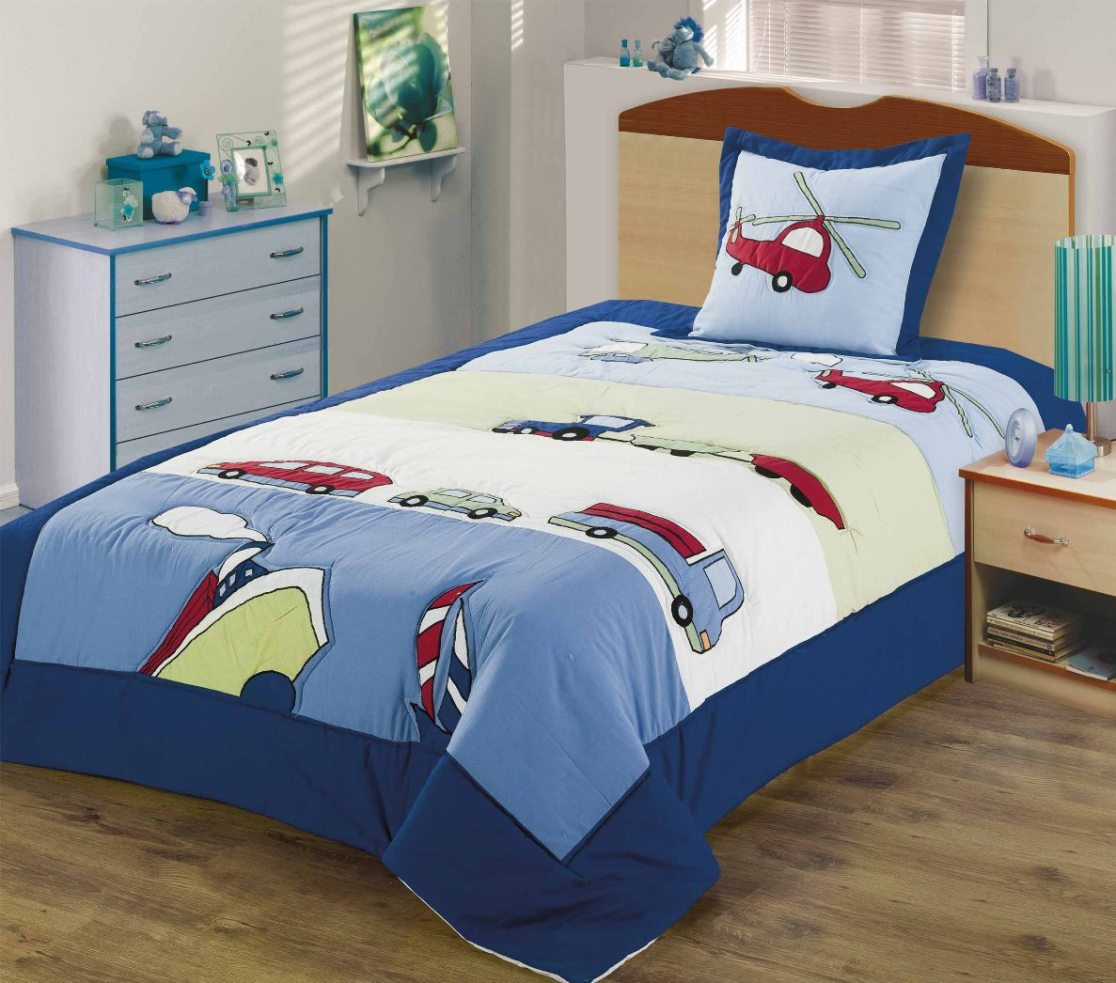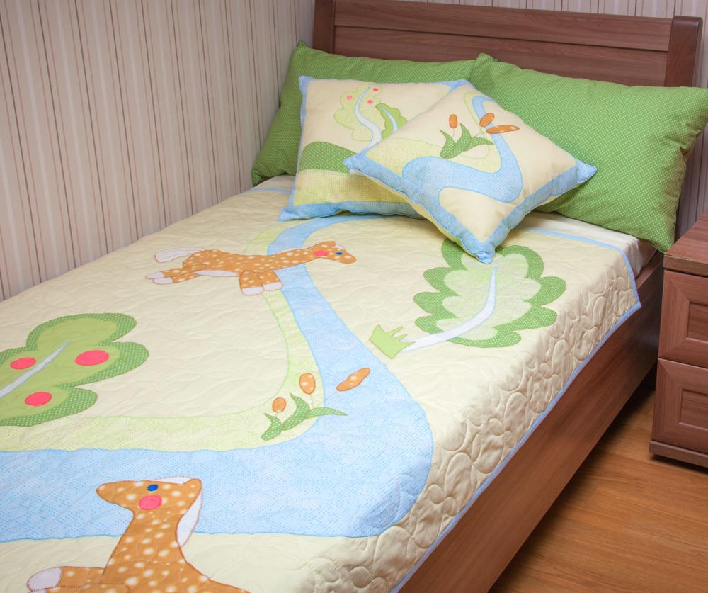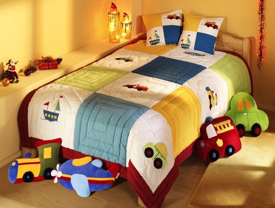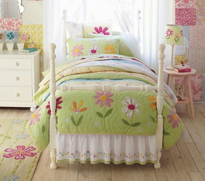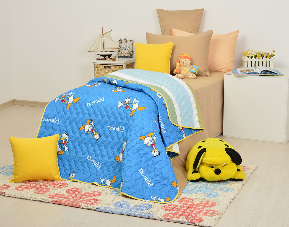 Für ältere Kinder können Sie mit Hilfe einer Tagesdecke einen hellen Akzent im Innenraum setzen. Helden von Lieblingsmärchen, Cartoons werden gut darauf aussehen und werden Ihr Baby nicht gleichgültig lassen. Aber solche Bettdecken können schnell nerven.Nach ein paar Monaten mag das Kind einen anderen Cartoon mögen und er wird eine neue Decke mit einem neuen Helden anfordern.