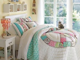 Die Bettdecke auf dem Bett im Kinderzimmer sollte mit dem Stil des Raumes kombiniert werden und kann auch ein heller Akzent darin sein.