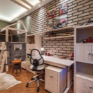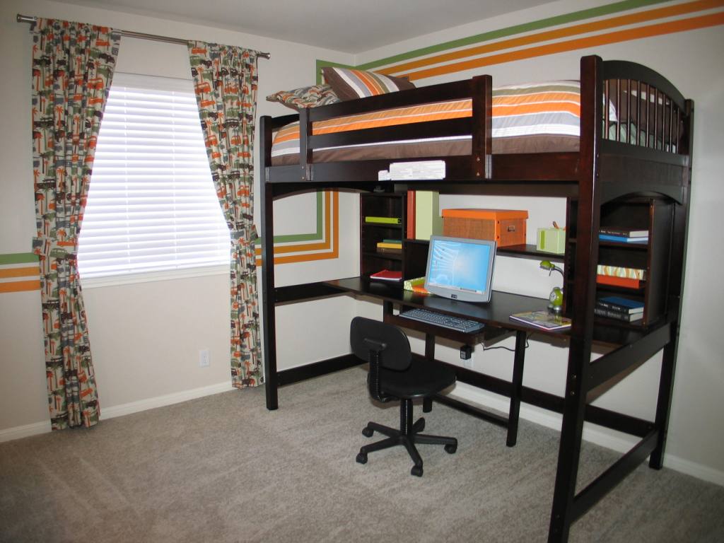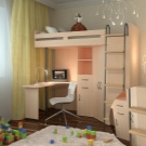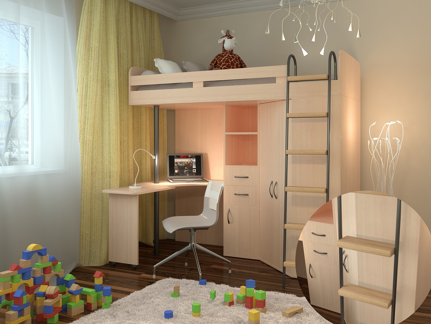 Die erste Stufe dieses Designs ist ein Schreibtisch mit Schubladen, ein Computerständer, ein Prozessorraum, Regale für Bücher und verschiedene Kleinigkeiten, ein geräumiger Kleiderschrank, Schulbedarf.