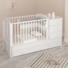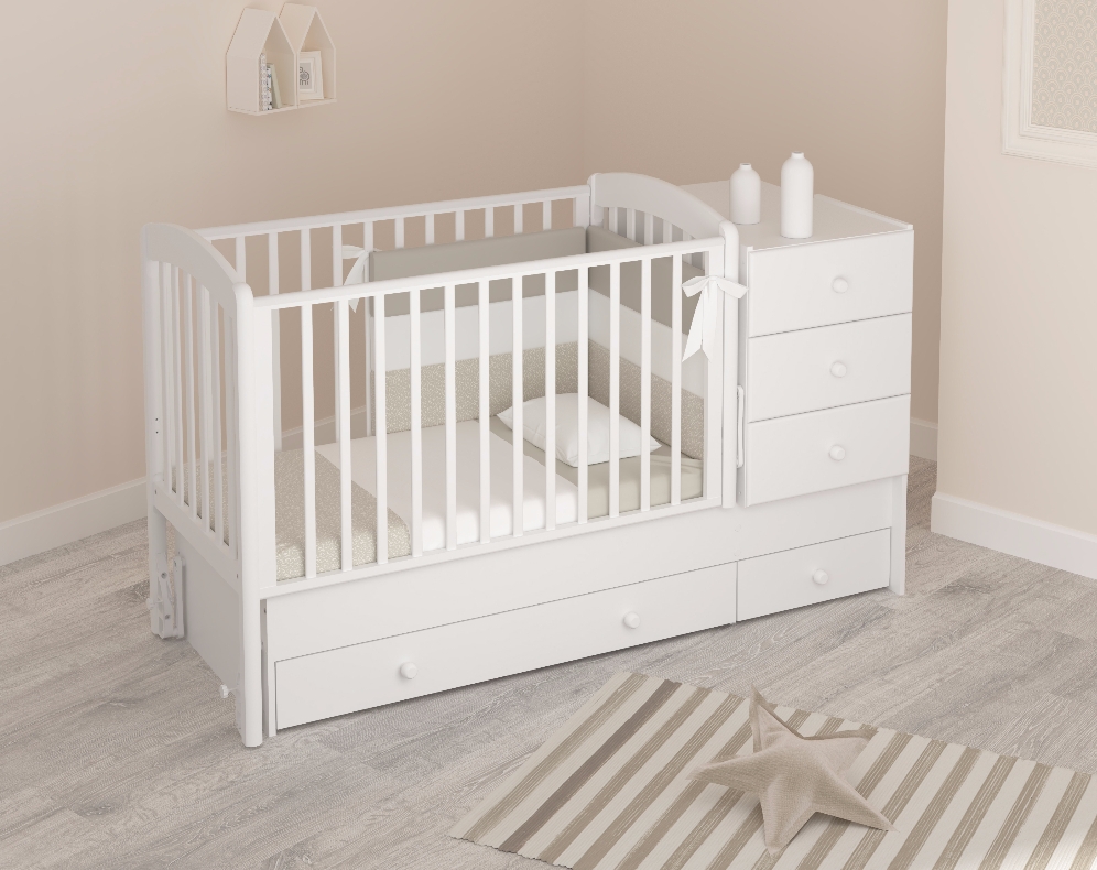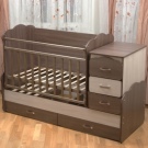 Ein weiteres beliebtes Modell - Chung-Chang, von der Firma "Die Insel der Gemütlichkeit" ist aus Kiefer, Birke und Spanplatten hergestellt. In seiner Zusammensetzung gibt es zusätzlich zu der Krippe mit einer Querpendelschaukel einen Wickeltisch und einen Wäscheschrank. All dies befindet sich auf einer einzigen BasisDeshalb können im Laufe des Aufwachsens eines Kindes zusätzliche Gegenstände leicht demontiert werden, eine lange Matratze wird gekauft - und das Bett für das Baby verwandelt sich in ein Teenagerbett.