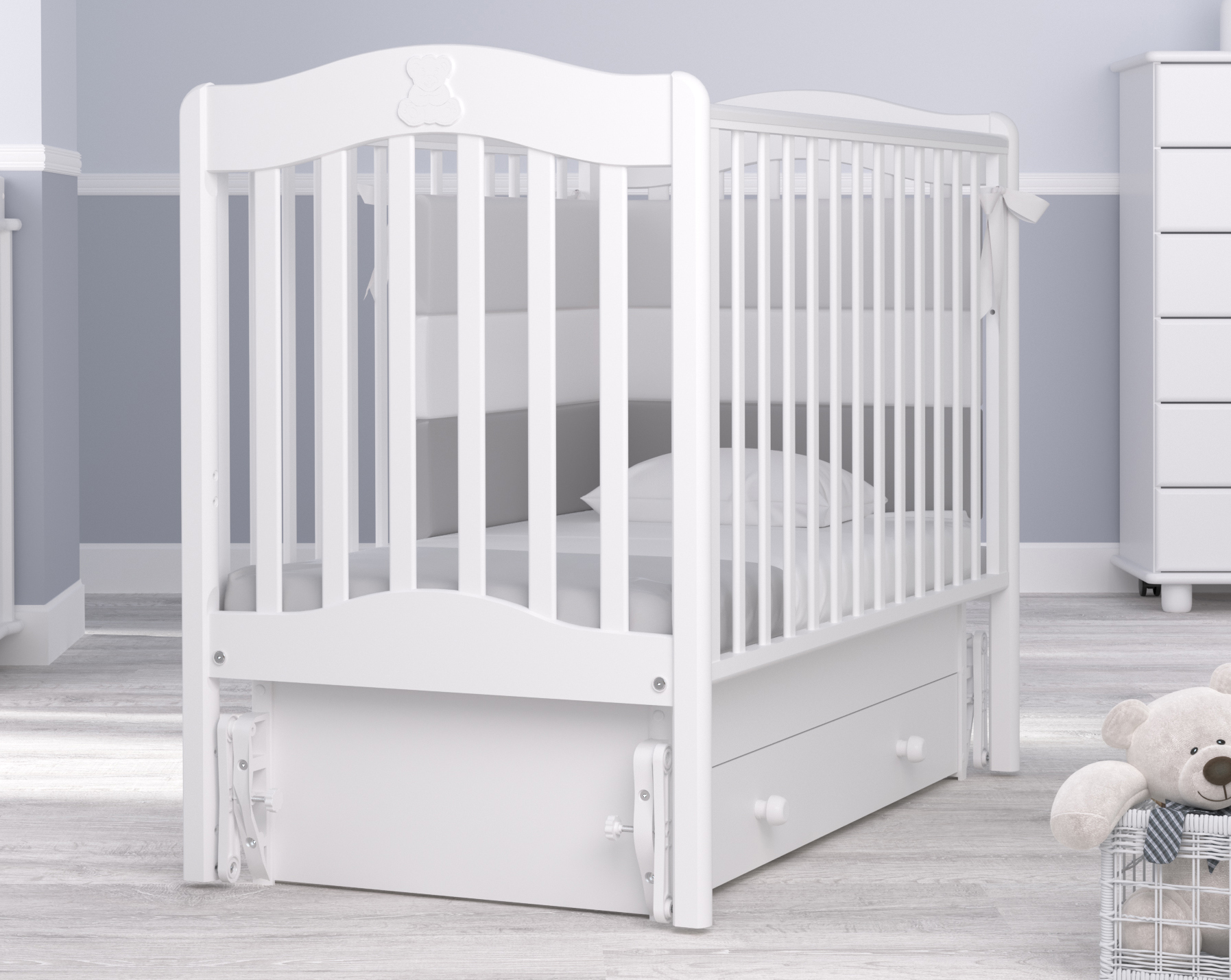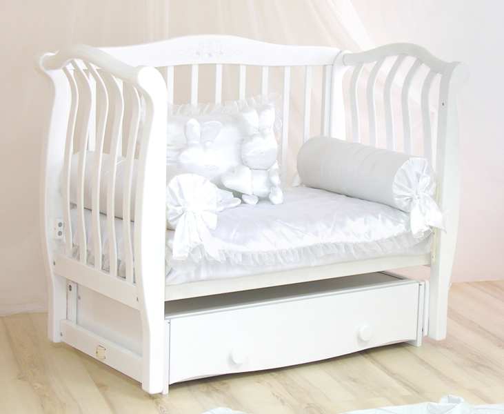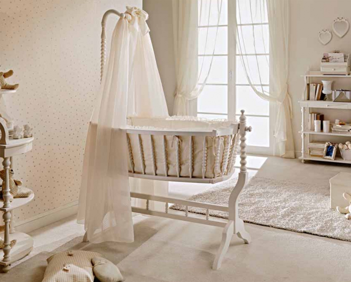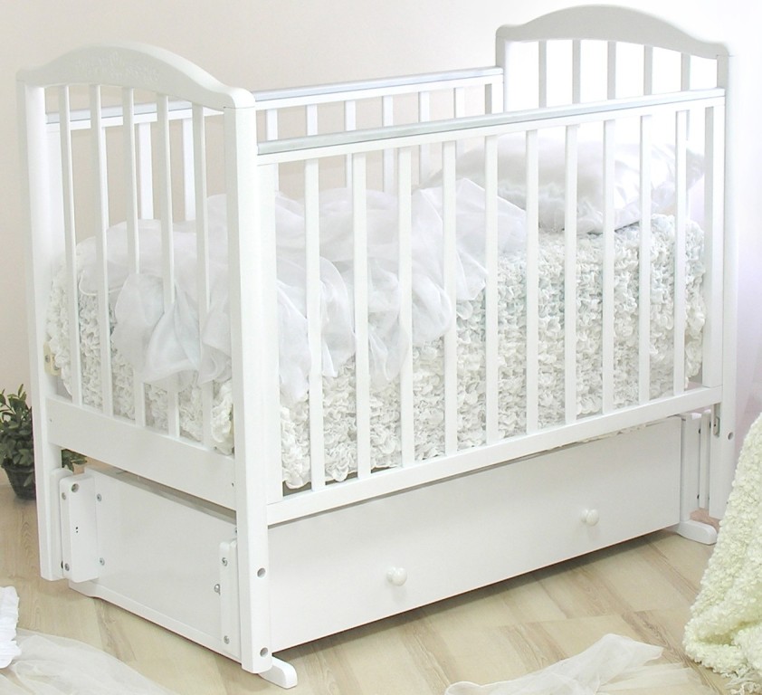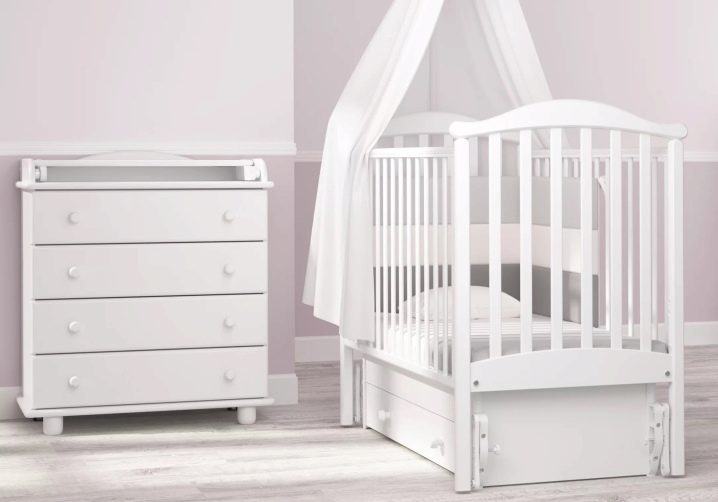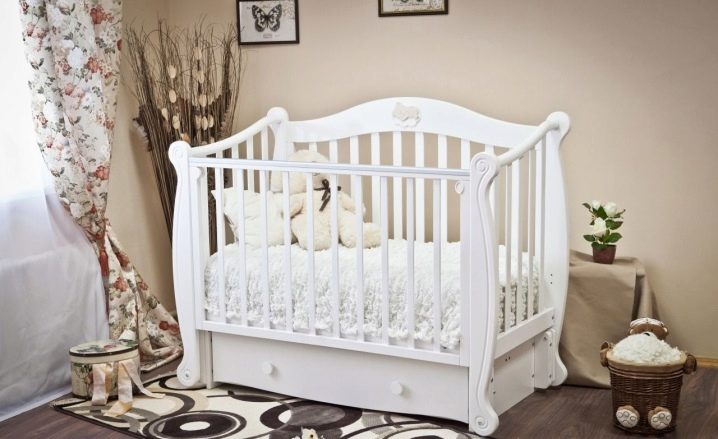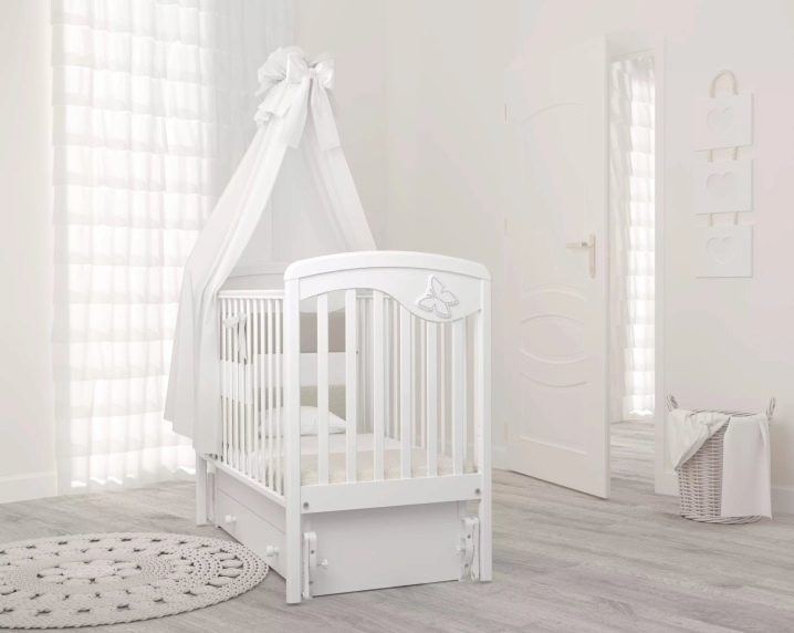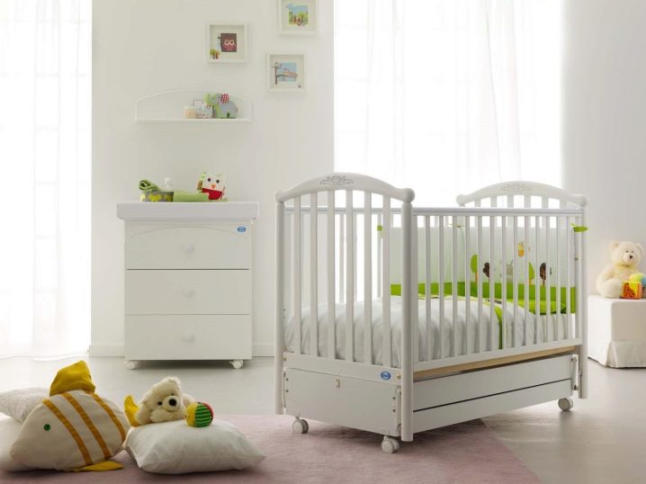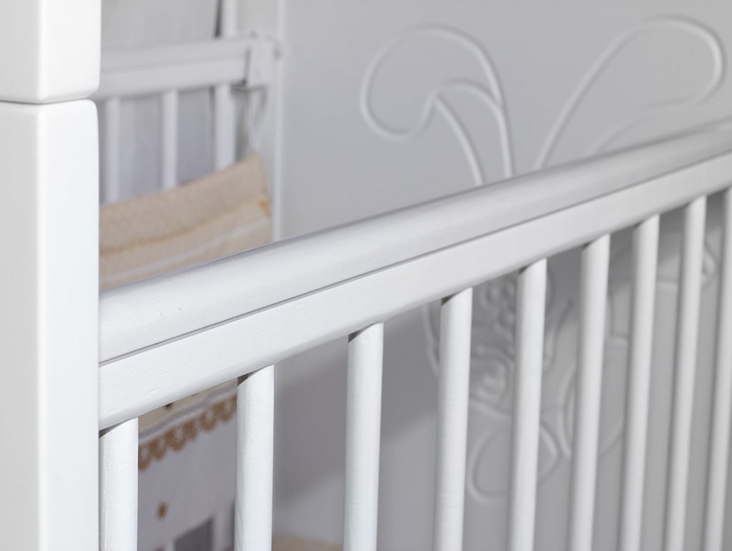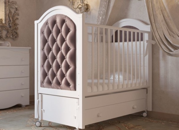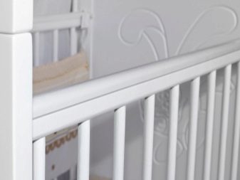 Normalerweise Krippen sind in verschiedenen Schattierungen von Holzfarbe gemacht, aber es gibt Ausnahmen. Ein weißes, in zarten Mint- oder Blautönen gehaltenes Bett versetzt das Baby in eine besinnliche Stimmung und schafft bei seinen Eltern eine beruhigende Stimmung. Es passt perfekt in das Design eines klassischen Kinderzimmers im romantischen Stil.