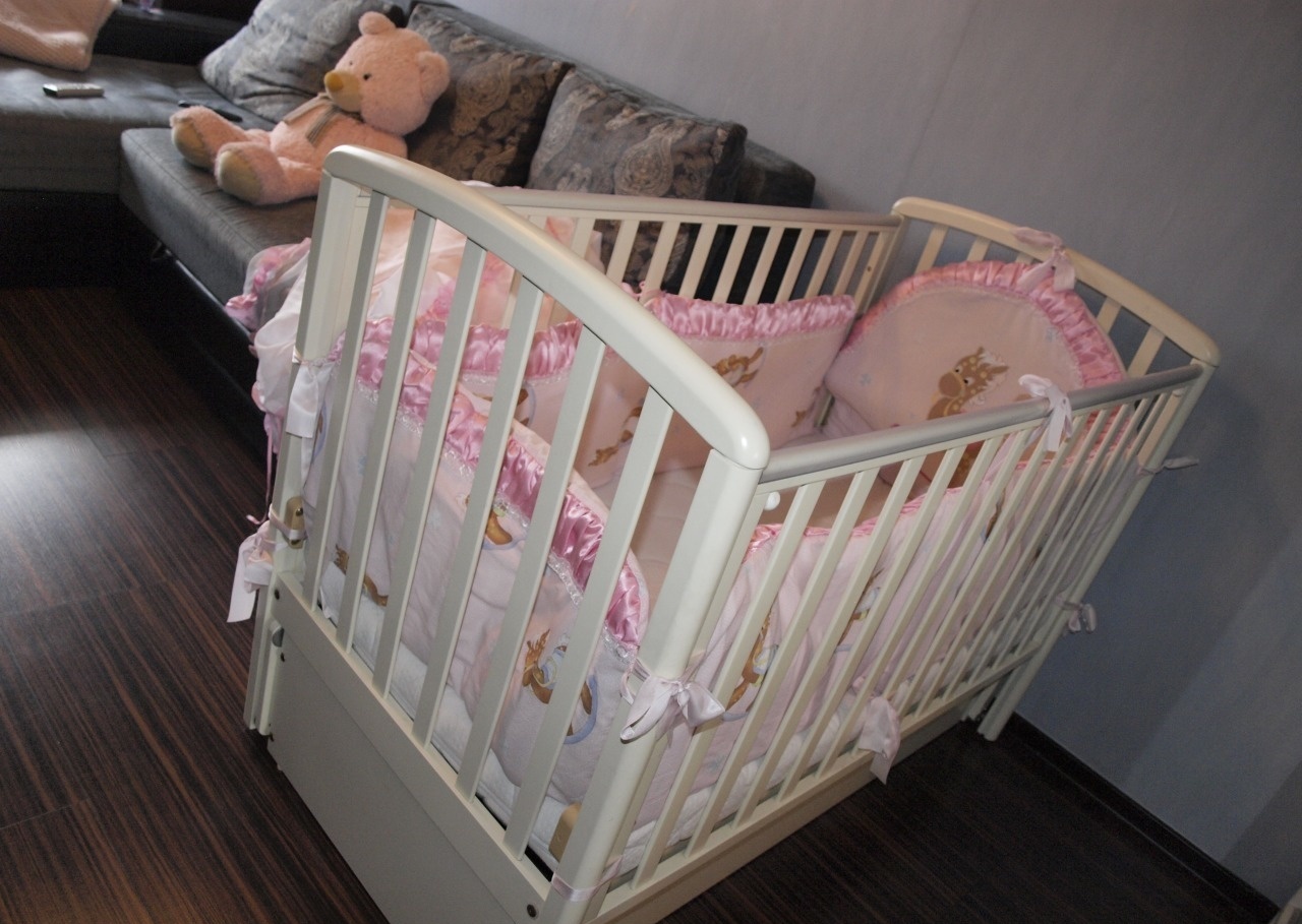 Bei Modellen von guten Herstellern sind zwangsläufig selbstzentrierende Räder mit Stoppern und Silikonpads an den Querträgern, den sogenannten "Nagetieren", vorgesehen. Dieses Bett ist fest, aber es kann zum Bett der Eltern gerollt werden, die Vorderwand ist abgesenkt - und in der Nacht wird es für die Mutter bequem sein, das Baby zu erreichen und es zu beruhigen, ohne aus dem Bett zu kommen.