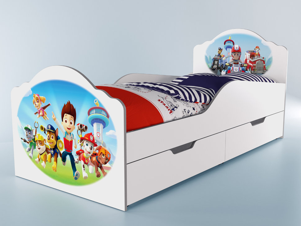 Es sieht sehr süßes Bett, mit niedlichen Hunden aus dem Cartoon "Paw Patrol" dekoriert. Ähnliche Drucke passen perfekt in ein Schlafzimmer für ein heranreifendes Kind von vier bis zwölf Jahren.