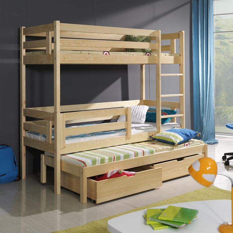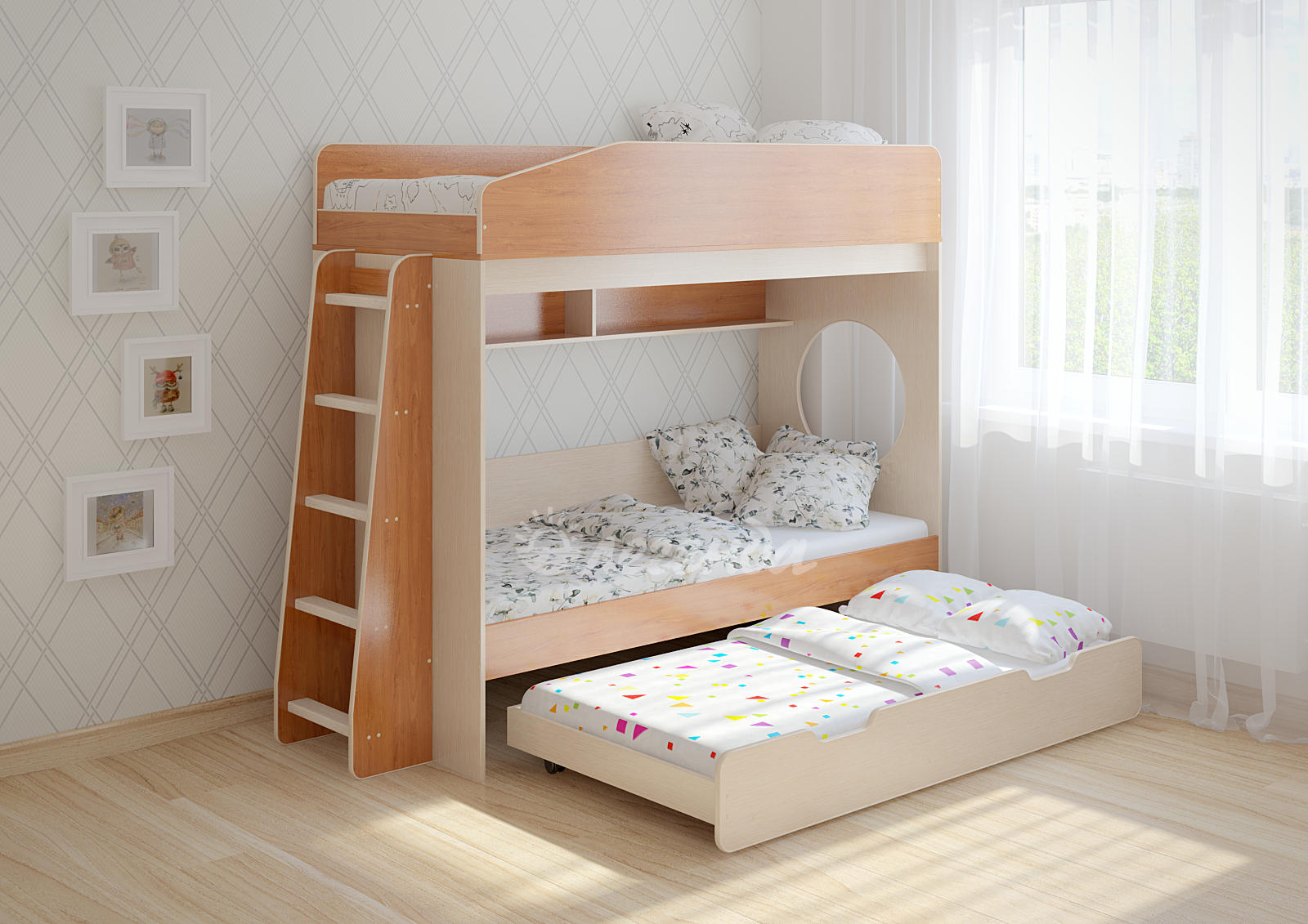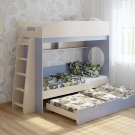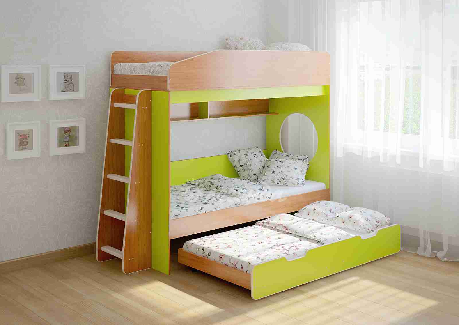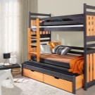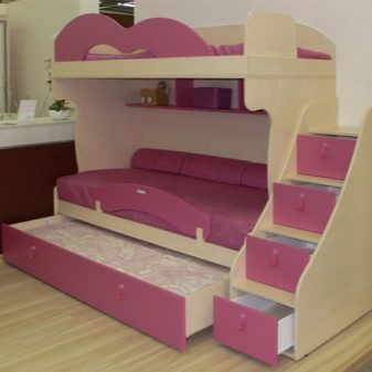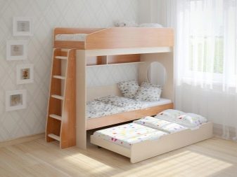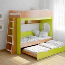 Dreibettbett des kombinierten Typs. Das Bett besteht aus mehreren Etagen. Der untere Teil ist ein Ausgangsmechanismus, der tagsüber leicht versteckt werden kann und somit zusätzlichen Raum im Raum spart. Nur das dritte Bett ist repariert. Der zweite und dritte in einer Reihe sind mit einer Leiter aufgereiht. Die maximale Höhe eines solchen Produkts beträgt etwa 1,5 Meter, was auch als zusätzliches Sicherheitsmaß dient, wenn ein Baby fällt.