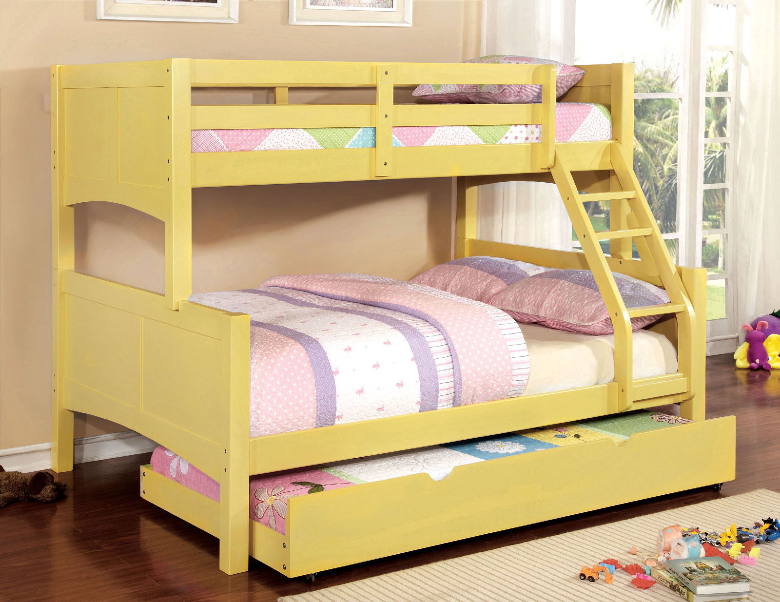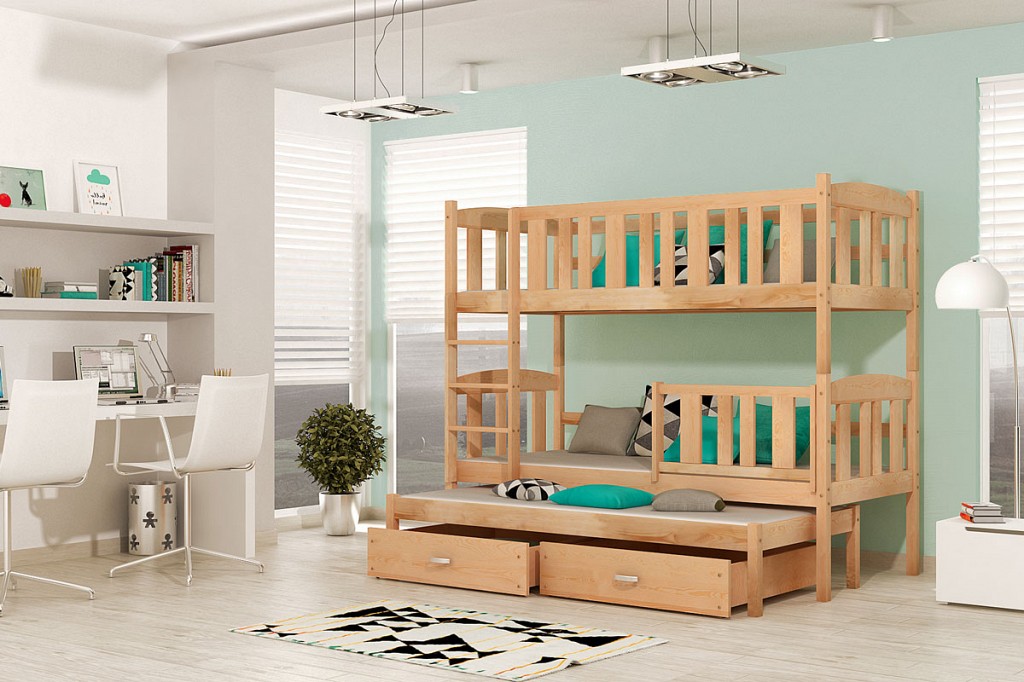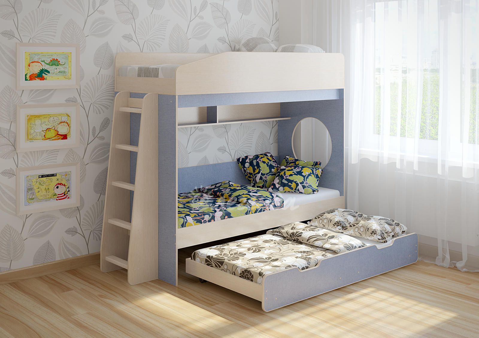 Dreibettbett des kombinierten Typs. Das Bett besteht aus mehreren Etagen. Der untere Teil ist ein Ausgangsmechanismus, der tagsüber leicht versteckt werden kann und somit zusätzlichen Raum im Raum spart. Nur das dritte Bett ist repariert. Der zweite und dritte in einer Reihe sind mit einer Leiter aufgereiht. Die maximale Höhe eines solchen Produkts beträgt etwa 1,5 Meter, was auch als zusätzliches Sicherheitsmaß dient, wenn ein Baby fällt.