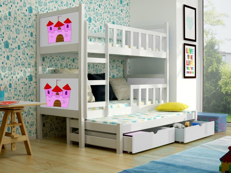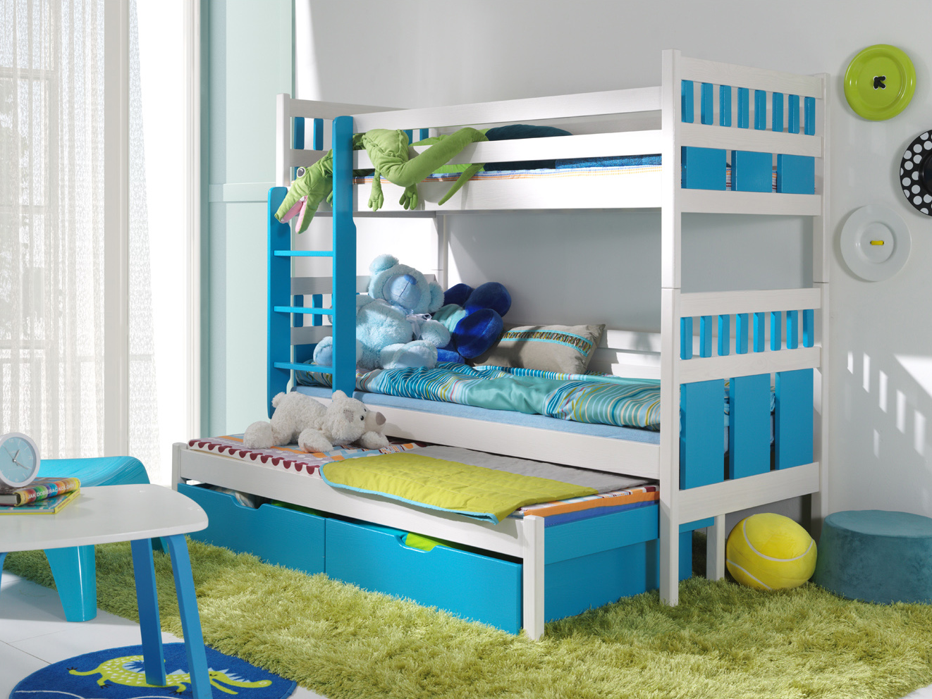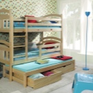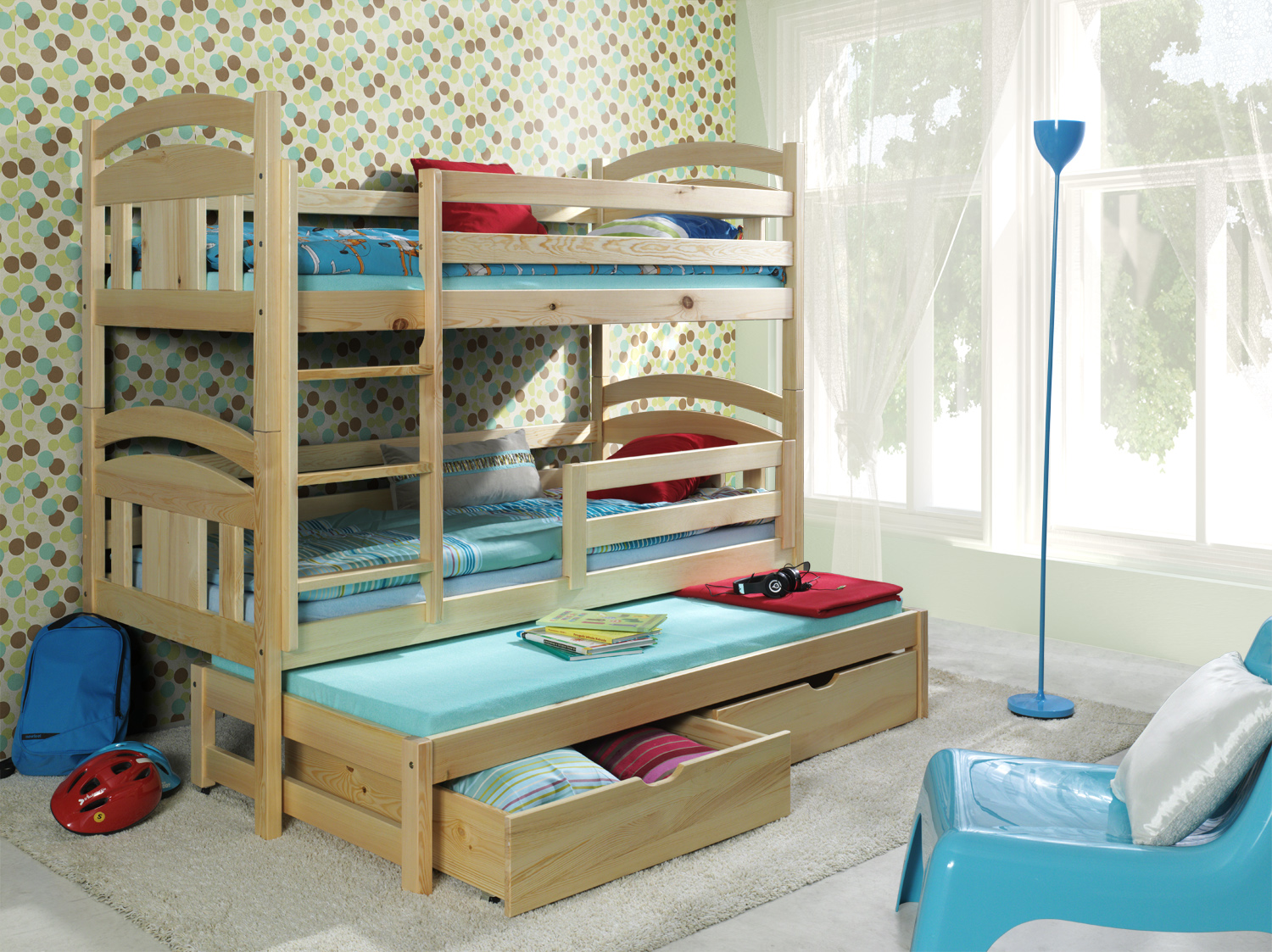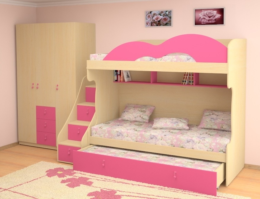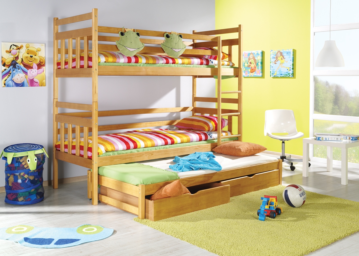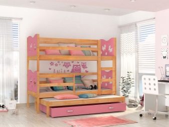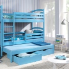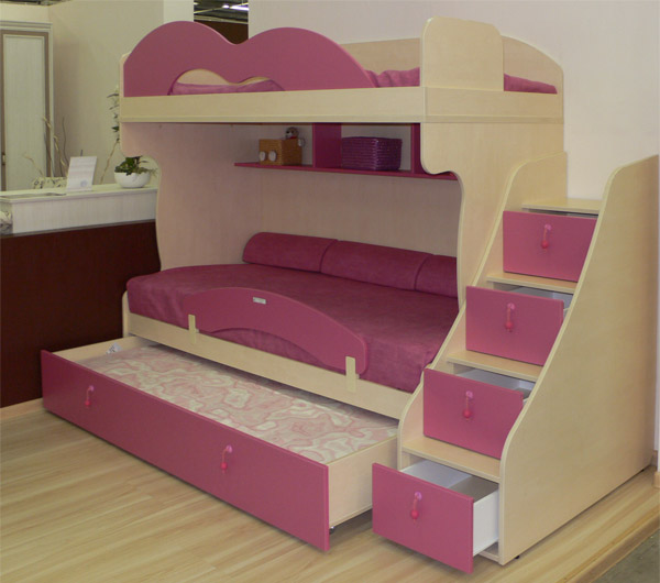 - Babybett mit Roll-out-Mechanismus. Dieses Bett ist die perfekte Lösung für Jungen und jüngere Mädchen. Bedenken Sie, dass der dreistöckige Liegeplatz klein sein wird. Der Vorteil ist, dass sich das dritte Bett erstreckt, normalerweise ist es in einer Nische oder einem Schrank verborgen, der obere Teil des Bettes ist befestigt. Es stellt sich das Gerät nach dem Matroschka-Prinzip heraus.