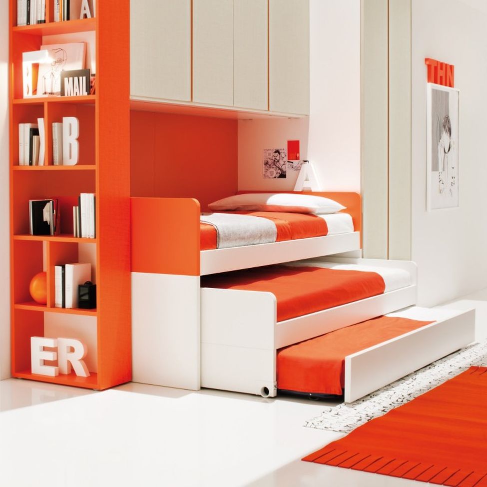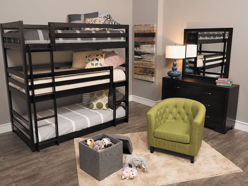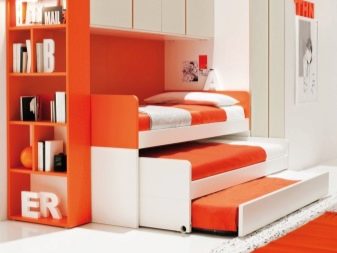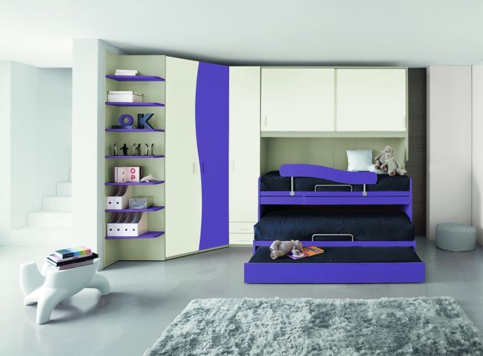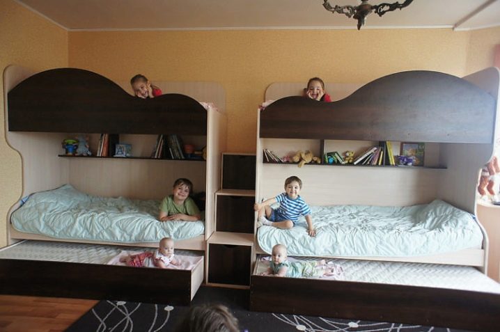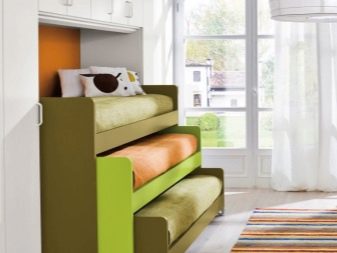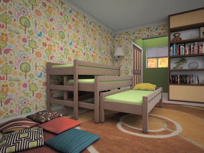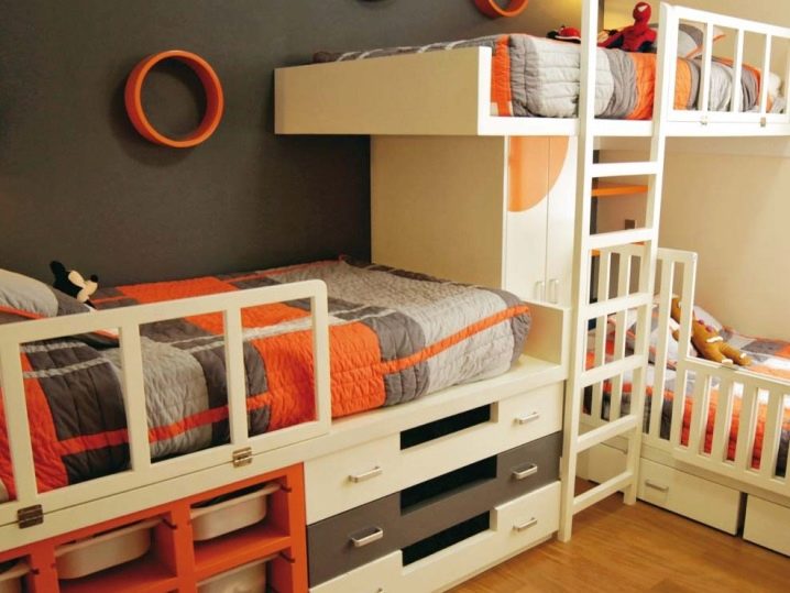 Mit einem katastrophalen Mangel an freien Platz im Raum, ist es am besten, ein dreistufiges Bett zu kaufen. Ältere Kinder können zu den oberen Betten geschickt werden, während die jüngeren die unteren Betten sicher besetzen können. So wird es eine unsichtbare Abgrenzung des Raumes geben.