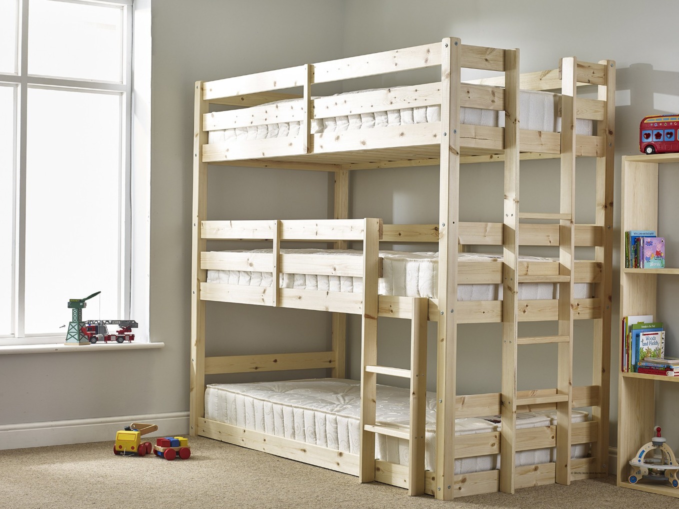 Wenn in einer Wohnung oder einem privaten Haus Deckenhöhen erlaubt sind, dann ist es am besten, dreistufige Betten zu kaufen. Kinder werden in gleichen Bedingungen sein. In solchen Möbeln gibt es eine große Treppe, mit der Sie zu jedem der Ebenen gelangen können.