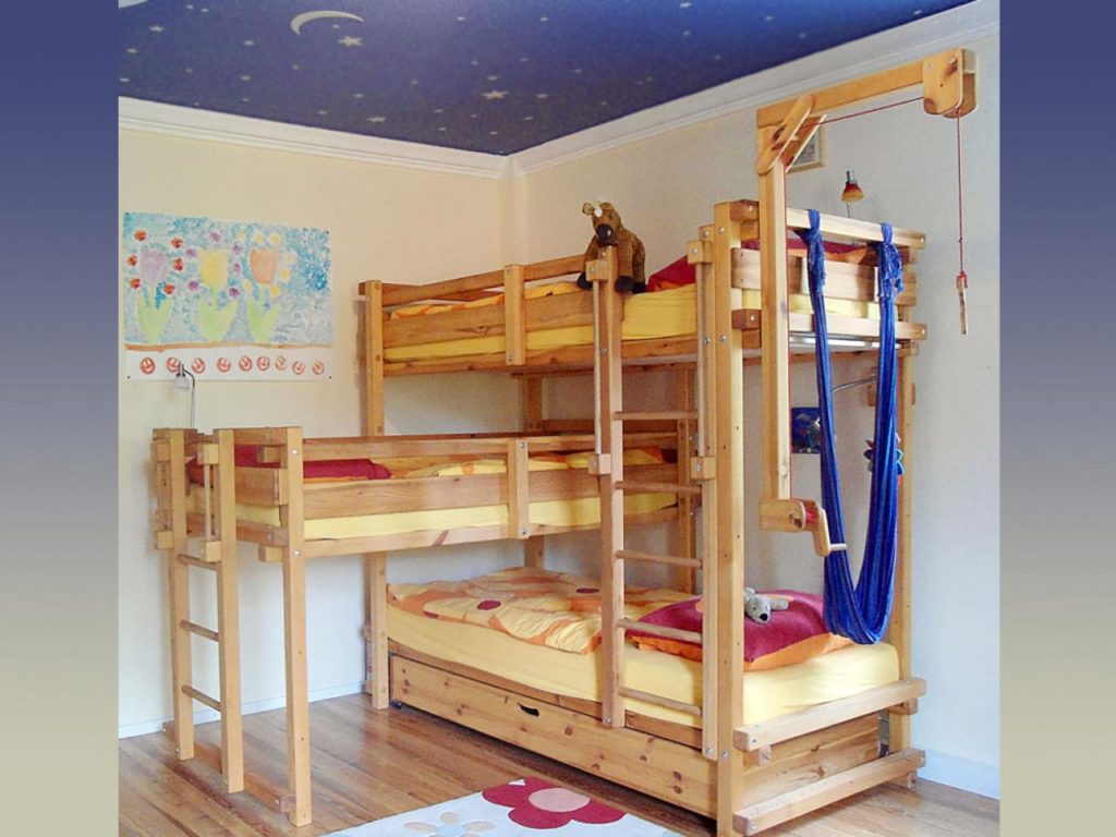 Für eine Familie mit 3 Kindern ist die beste Lösung ein Eckmodell eines Etagenbettes.So wird Platz gespart und es bleibt viel Platz, um solche zusätzlichen Möbel wie Stühle, Tische, Bücherregale zu arrangieren.