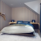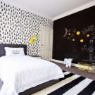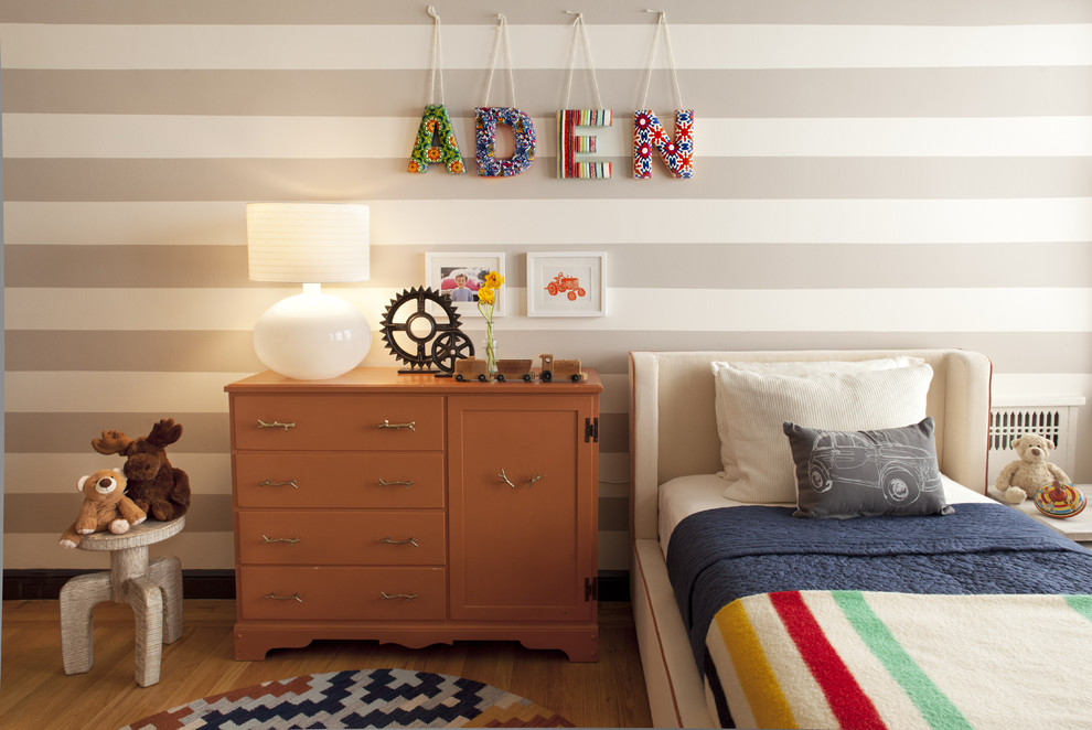 Eine andere Option ist Tapete mit einem Ornament. Die beste Wahl wäre Streifen - das ist ein neutrales Muster, das für jedes Alter geeignet ist. Vielleicht eine Kombination von Streifen mit einfachen Tapeten, die Hauptsache, um die Kombination von Farbtönen zu beobachten. Die Besonderheit der gestreiften Tapete liegt in ihrer Fähigkeit, die Proportionen des Raumes visuell zu korrigieren - die vertikalen Streifen werden den Raum höher und die horizontalen Streifen breiter machen.