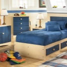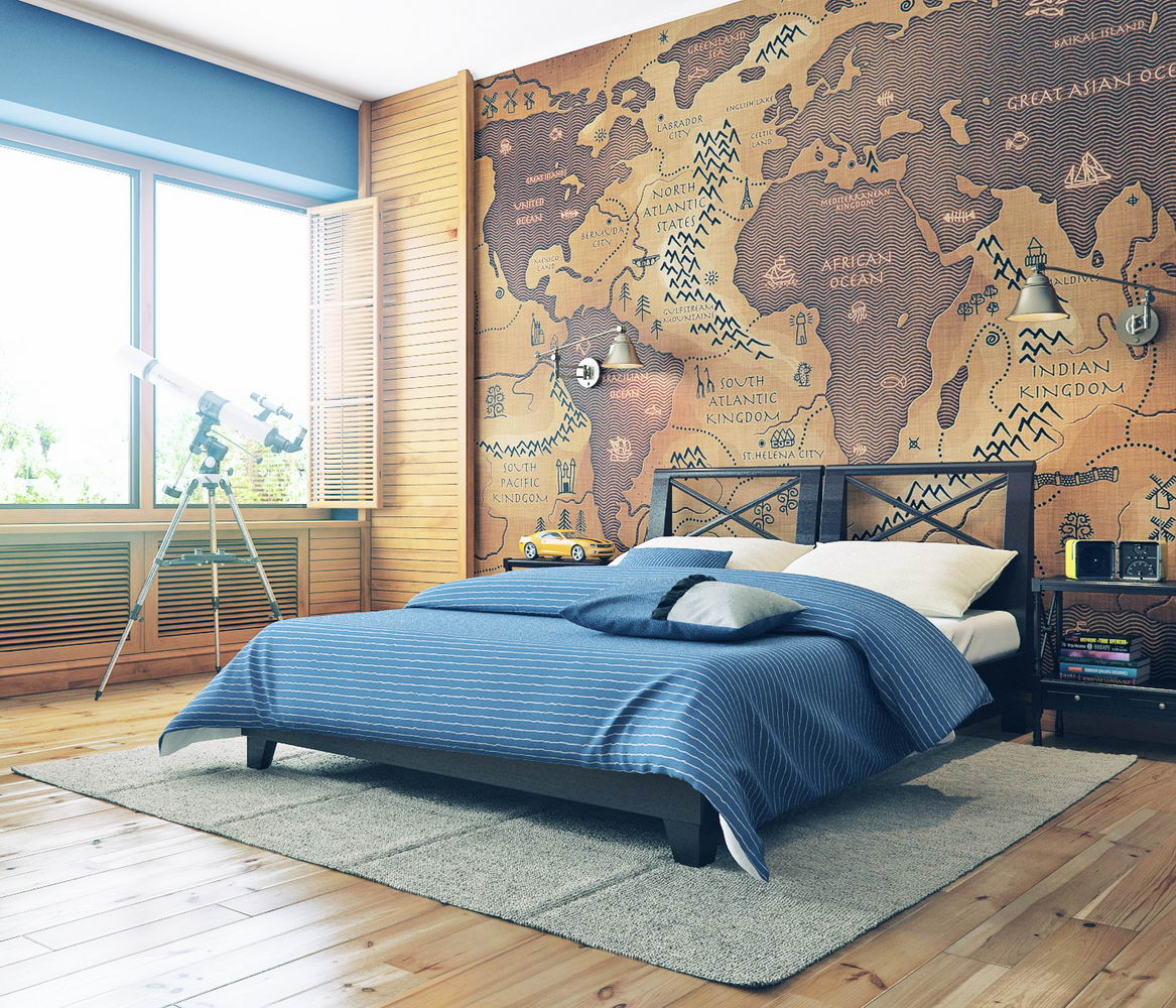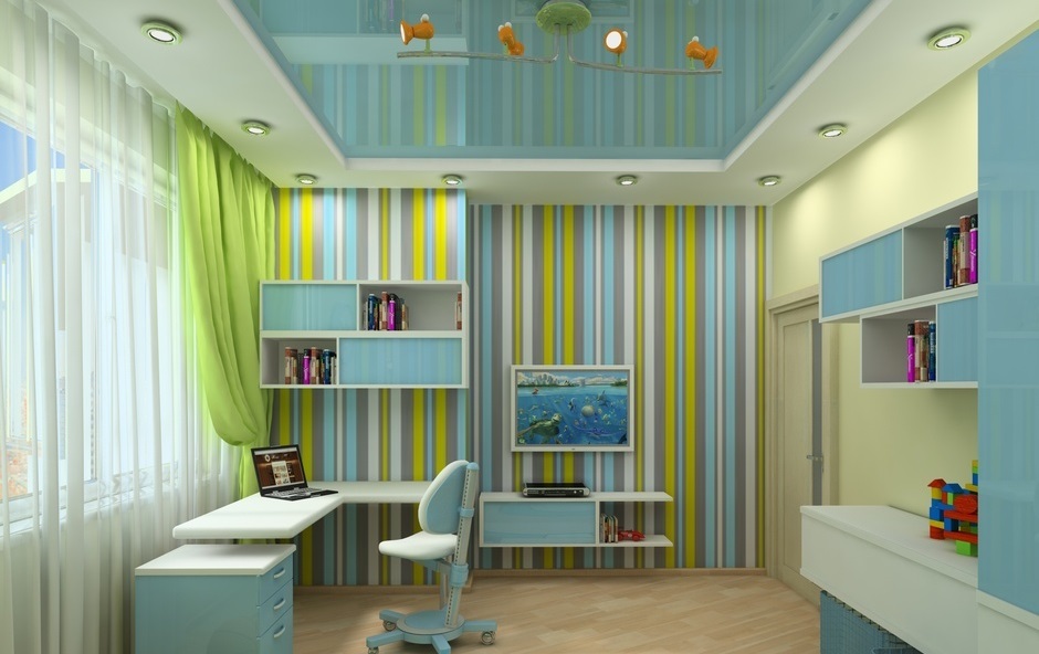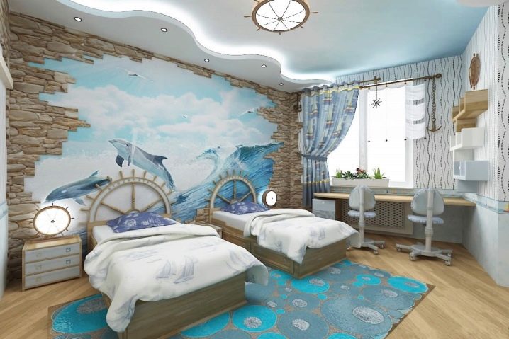 Mag der Sohn das Meer? Eine interessante Designlösung ist in diesem Fall die Gestaltung seines Zimmers in Blau mit Seamustern auf der Tapete. Immerhin ist bekannt, dass die Wände - so beginnt der Eindruck des ganzen Raumes, nämlich mit dem Farbschema der Tapete.