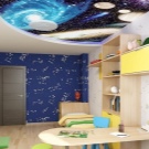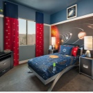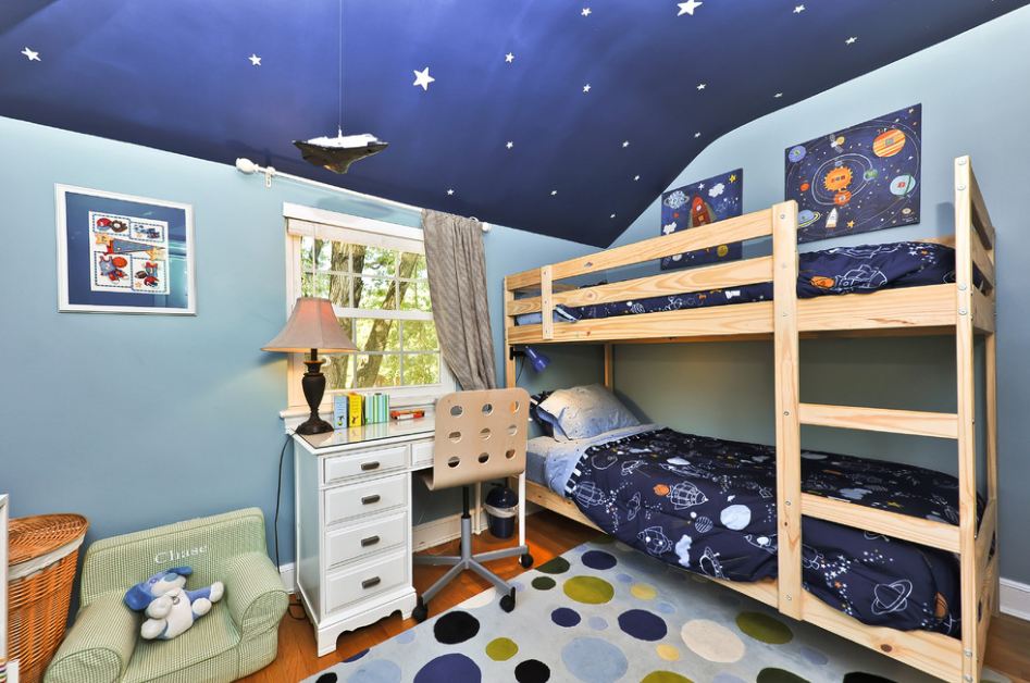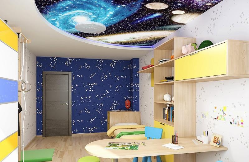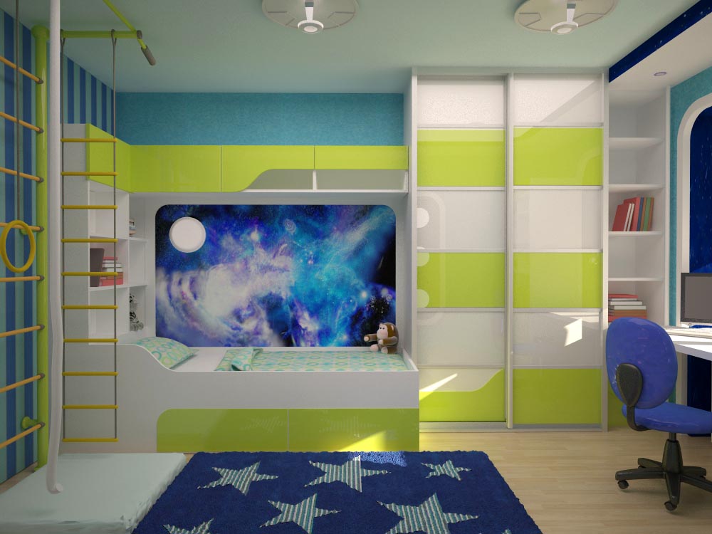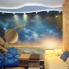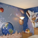 Diese Wand ist mit einem interessanten Muster für das Kind dekoriert, und in der Nähe befindet sich die Zone, in der das Kind am häufigsten spielt. Wenn das Lieblingsthema des Jungen der Raum ist, dann werden Fototapeten auf einem Weltraumthema funktionieren: mit Sternen, Planeten, einer Rakete.