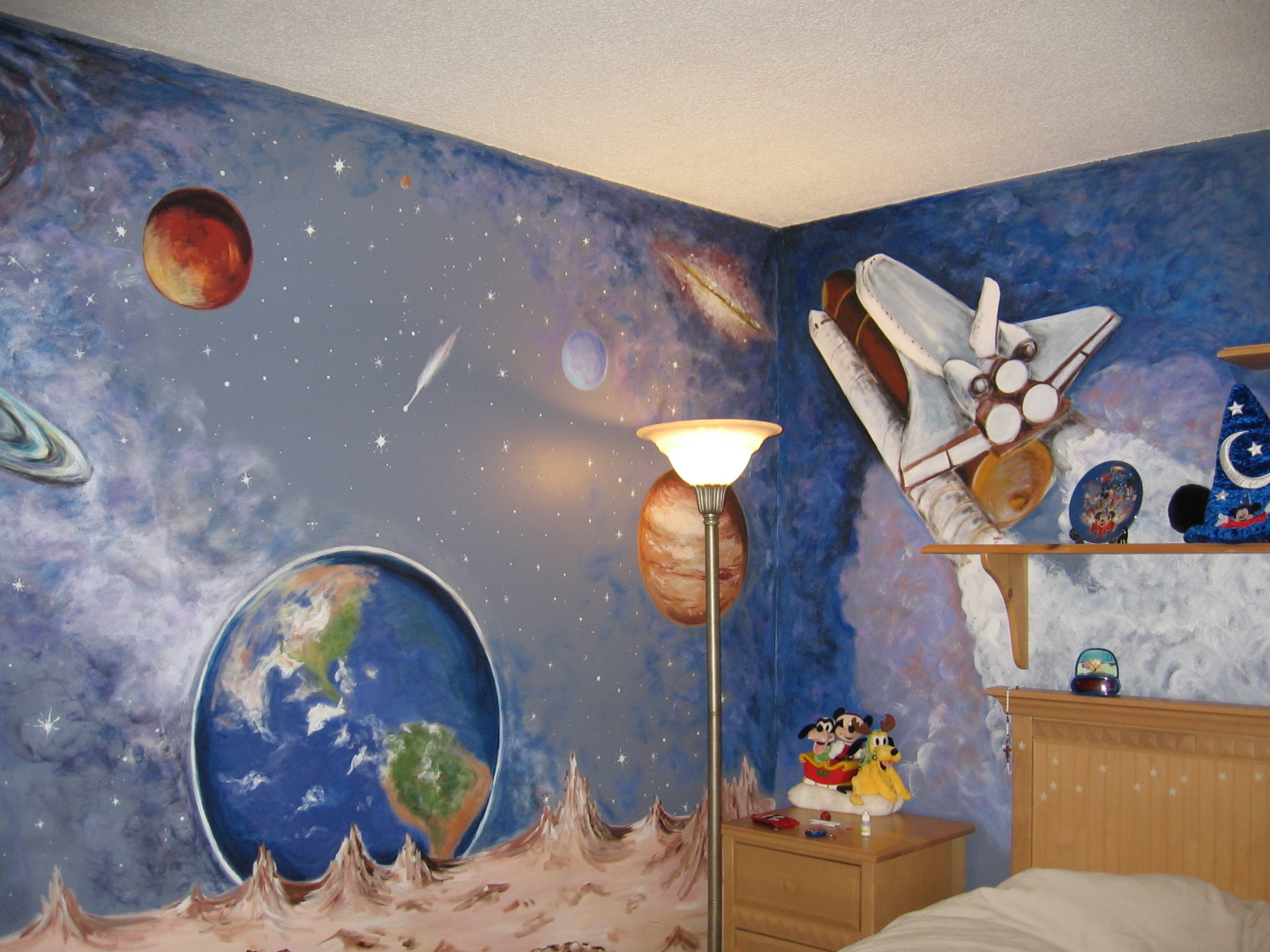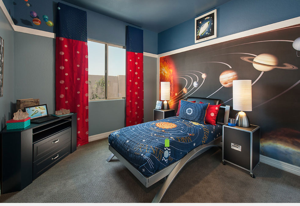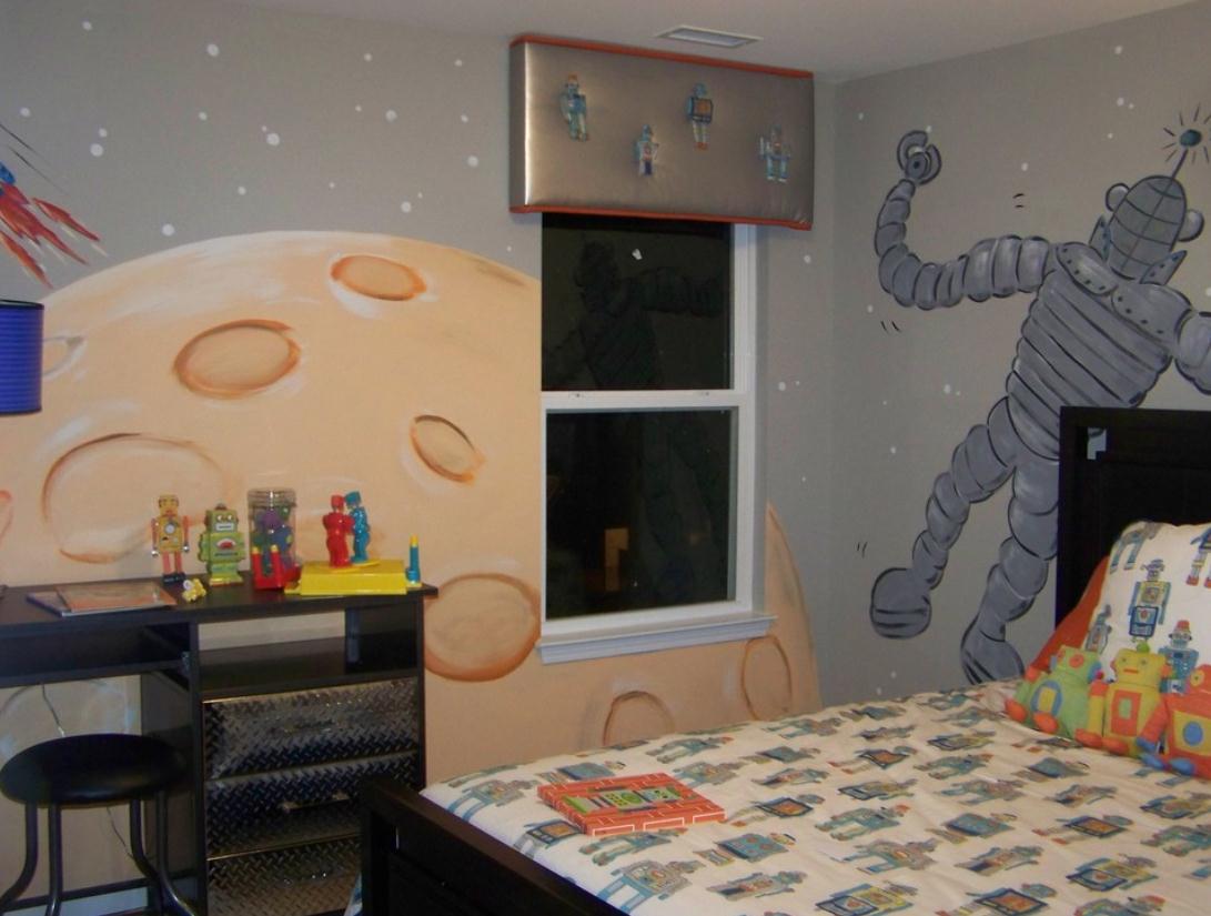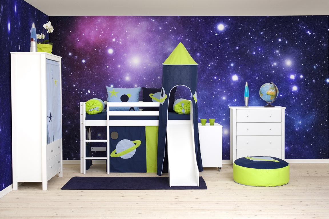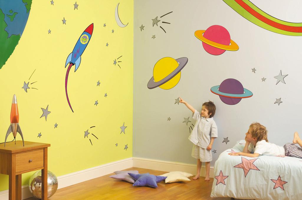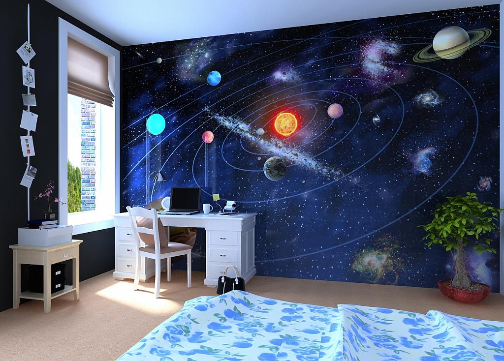 Kleine Träumer, die Cartoons über Weltraumreisende lieben und bereits von zukünftigen Erkundungen des Universums träumen, wird es interessant sein, auf den Wänden ihrer Raum-Szenen-Szenen auf Tapeten zu sehen.Sie sind an Ort und Stelle, im Spielzimmer und im Schlafzimmer, und dann verwandelt sich der Spieltisch Ihres Babys in eine Schalttafel und sein Bett in eine Raumkapsel.