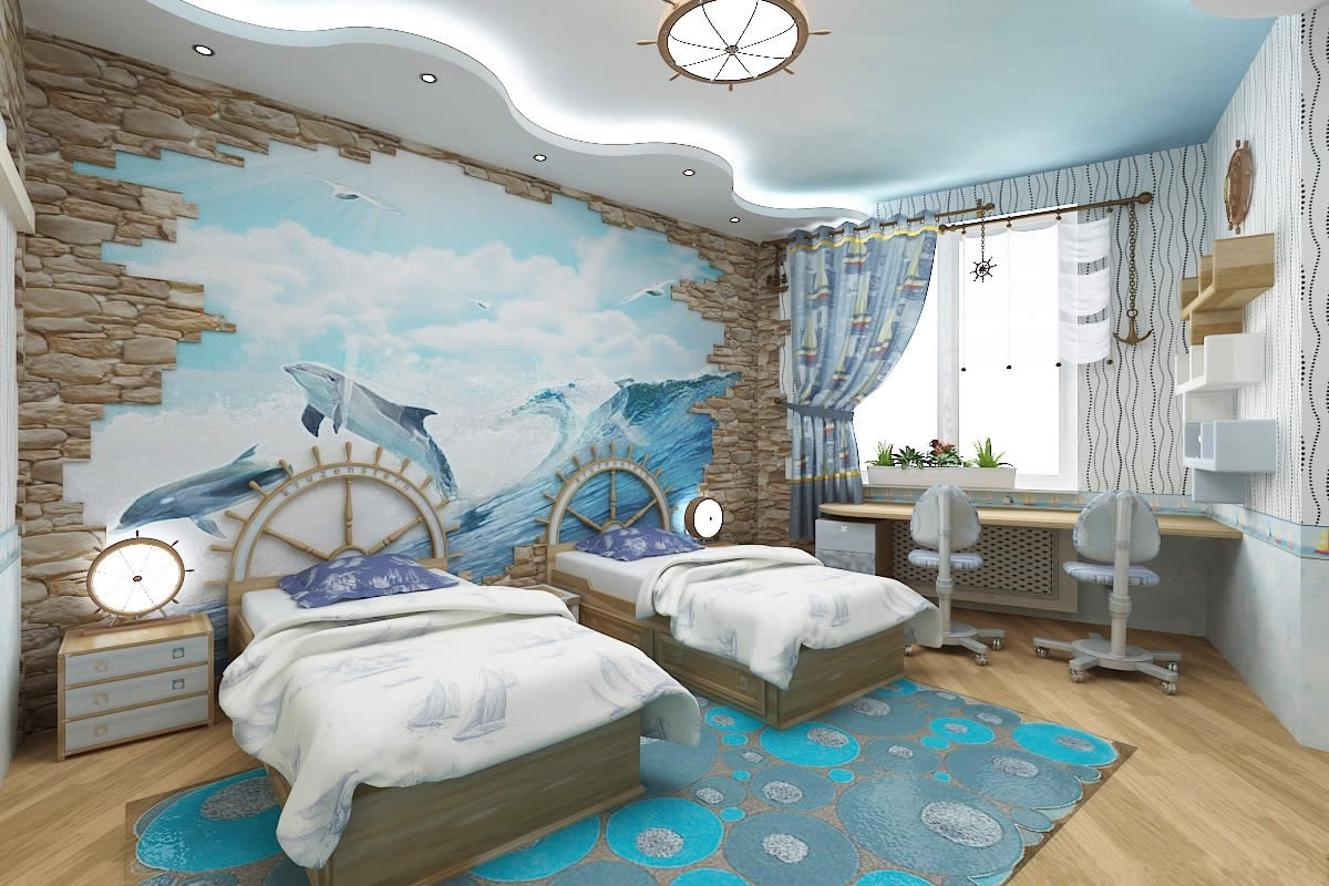 Zukünftigen Seglern wird empfohlen, Tapeten in Aqua oder Tönen ähnlich dieser Farbe zu wählen. Meerjungfrauen sind nicht an dem Jungen interessiert, aber die Unterwasserwelt und Segelboote sind durchaus möglich.