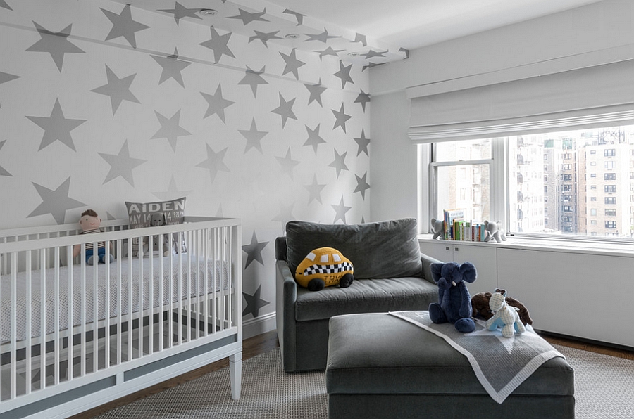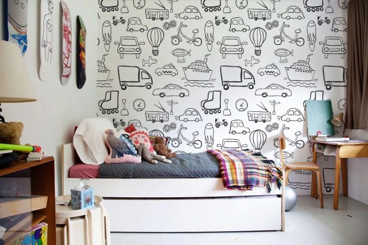 Die Hauptsache für ein Neugeborenes ist, dass die Tapete in seinem Zimmer hell und warm sein sollte. Es ist gut, dass sie Zeichnungen in Form von Kinderspielzeug hatten: Schiffe, Autos, Bären. Die Zeichnungen sollten mäßig hell sein, dann wird der Junge daran interessiert sein, sie zu betrachten.