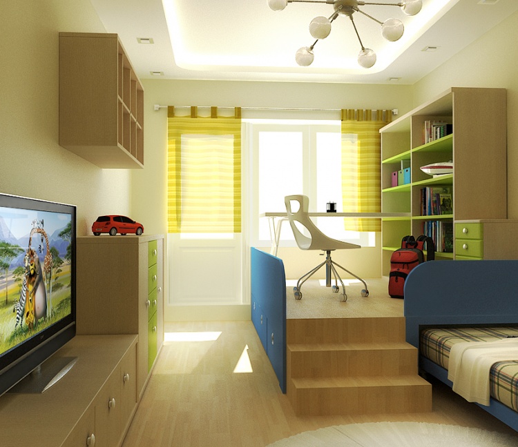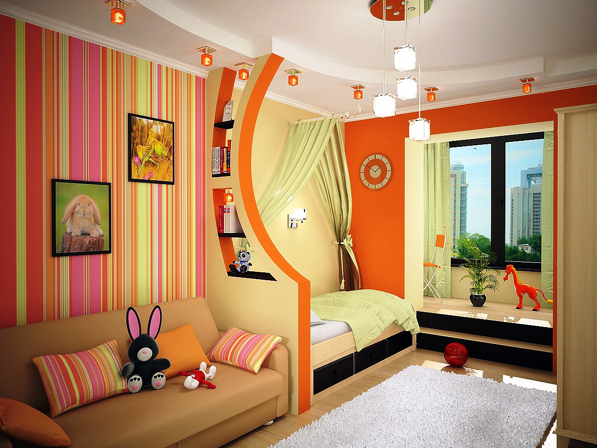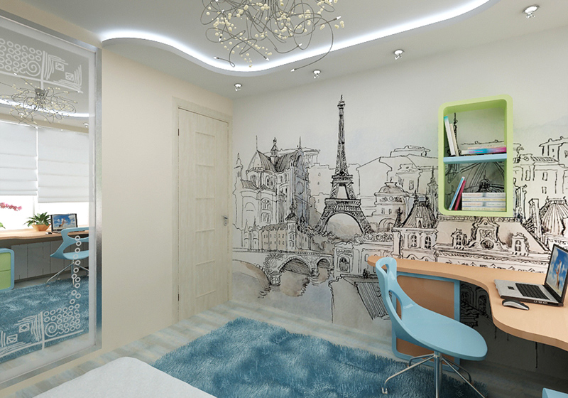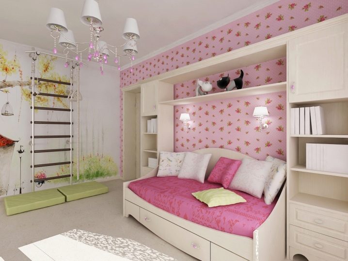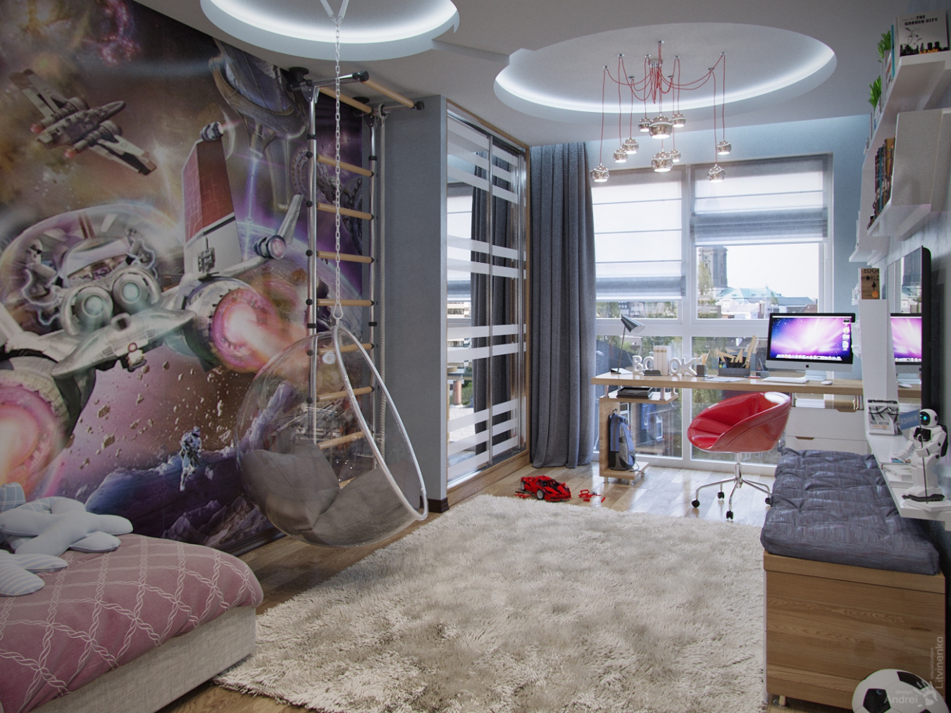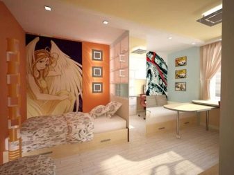 Nicht die letzte Rolle, die das Geschlecht des Kindes spielt. Dies sollte sich auch in der Wahl der Innenraumlösung des Wohnraumes widerspiegeln. Mädchen werden sanfter, mit einem Hauch von Romantik, für mehr junge Leute, brutalere Elemente, gewichtigere Farben werden angemessen sein. Zum Beispiel kleine "Action-Spiele" - erzählende Kompositionen an den Wänden scheinen ihnen nützlich zu sein.