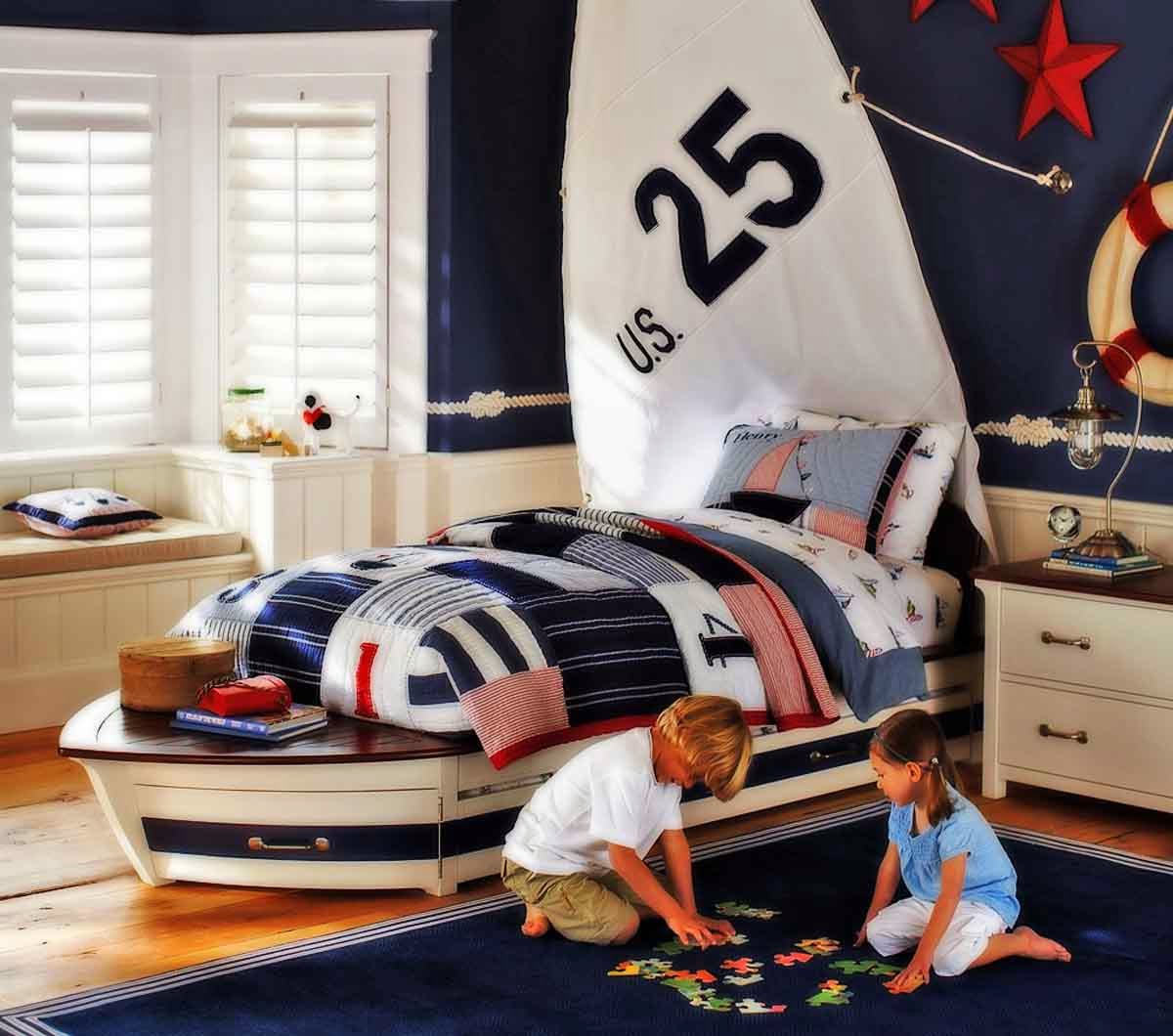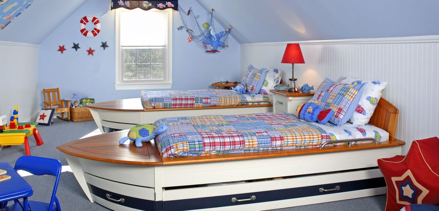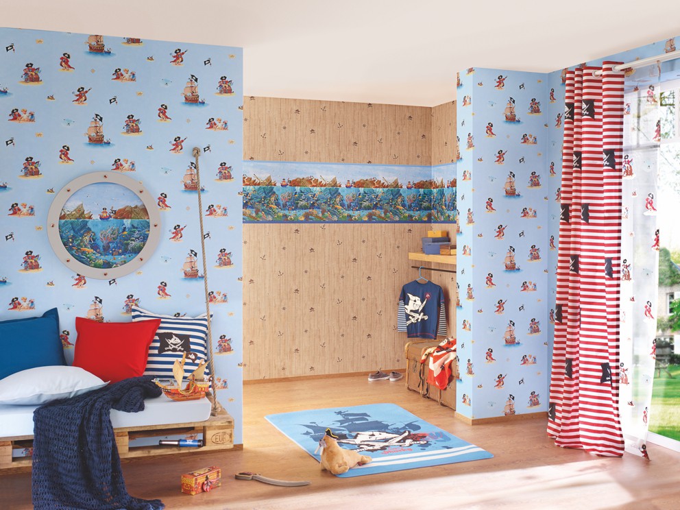 Bei all den vielfältigen Angeboten auf dem Tapetenmarkt sollten Sie verstehen, dass allein die Auswahl hochwertiger Tapeten nicht ausreicht. Es ist wichtig, ihre Stärken auf originelle Weise zu nutzen, um einen außergewöhnlichen Raum zu schaffen. Um einen interessanten Platz im Raum zu schaffen, schlagen wir vor, im Kinderzimmer die folgenden Prinzipien des Interior Designs anzuwenden. Sie können mit einer schönen Fregatte ein Seestück an der Wand platzieren und den Raum mit Tapeten aus hellem Aquafarbton bekleben.