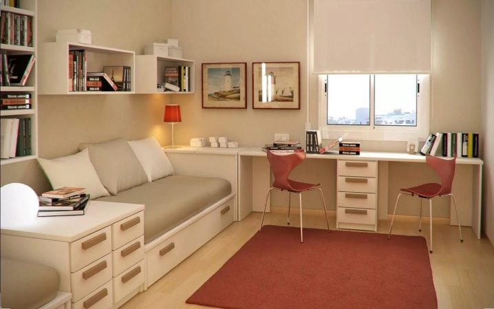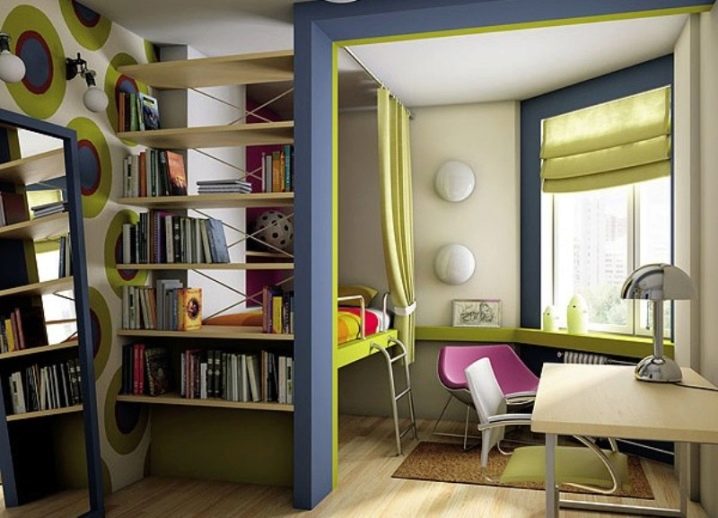 Wir betonen, dass es eine gute Option wäre, einen Raum in separate Zonen zu zerlegen. Das Werkzeug zur Lösung dieses Problems ist das Hintergrundbild. Im Schlafraum lassen Sie die Wände mit beruhigenden Farben dekorieren, und an einem Ort, an dem das Kind den Unterricht entscheidet, können Farben erscheinen, die ihn auf geistige Arbeit einstellen und ihm helfen, sich zu konzentrieren.