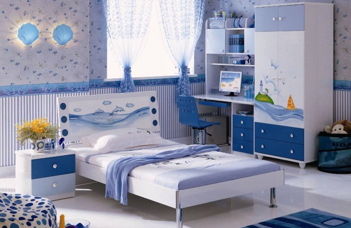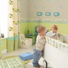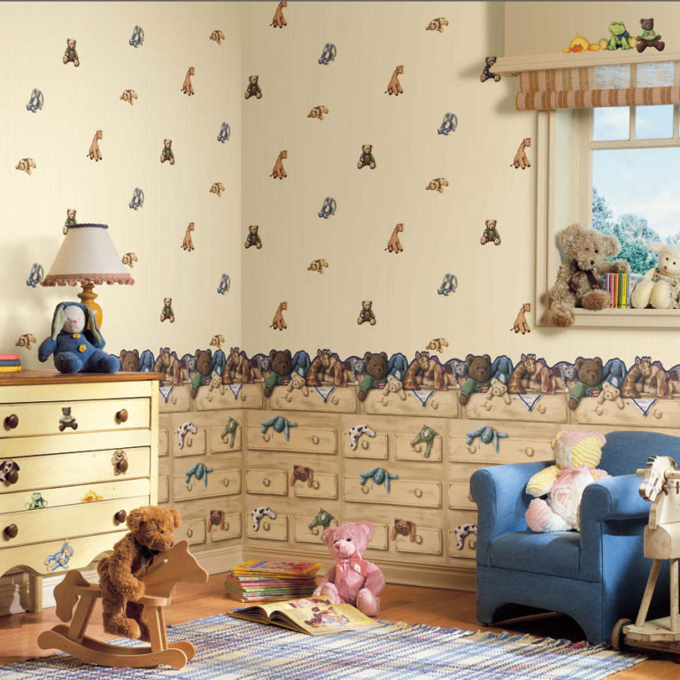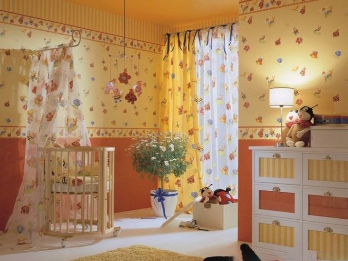 Bei der Registrierung eines Raumes im thematischen Stil, verwenden Sie Parzellen mit Blumen, Tieren, Thema des Meeres und der Natur ist ebenfalls erlaubt. In diesem Fall ist der obere Teil der Wände mit einfachen hellen Tapeten verziert. Bevor die Wände fertiggestellt werden, ist es notwendig, die Höhe der Raumteilung zu bestimmen. Es wird empfohlen, helle Tapeten in einer Höhe über der Körpergröße des Kindes zu kleben und so einen maximalen Schutz vor Verschmutzung zu gewährleisten. Um die Fugen zwischen den Leinwänden optisch zu verstecken, genügt es, spezielle Ränder oder Bänder auf ihrer Oberfläche anzubringen.